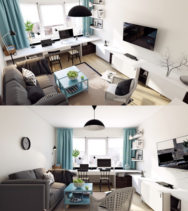 您不需要大量空間來執(zhí)行這些想法。青色的互補色調(diào)(在躺椅和現(xiàn)代沙發(fā)中)和超流暢的線條在這里是完美的。