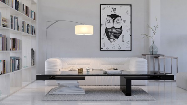 這種風格的極簡主義被超大貓頭鷹畫的奇思妙想所抵消。獨特的大型落地燈增添了特殊的觸感。