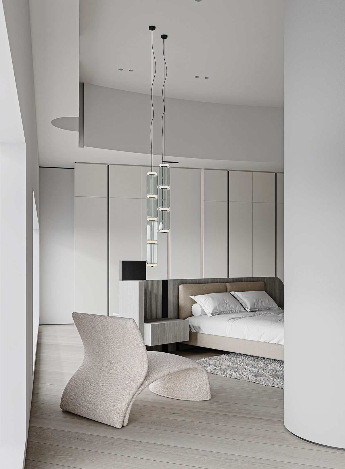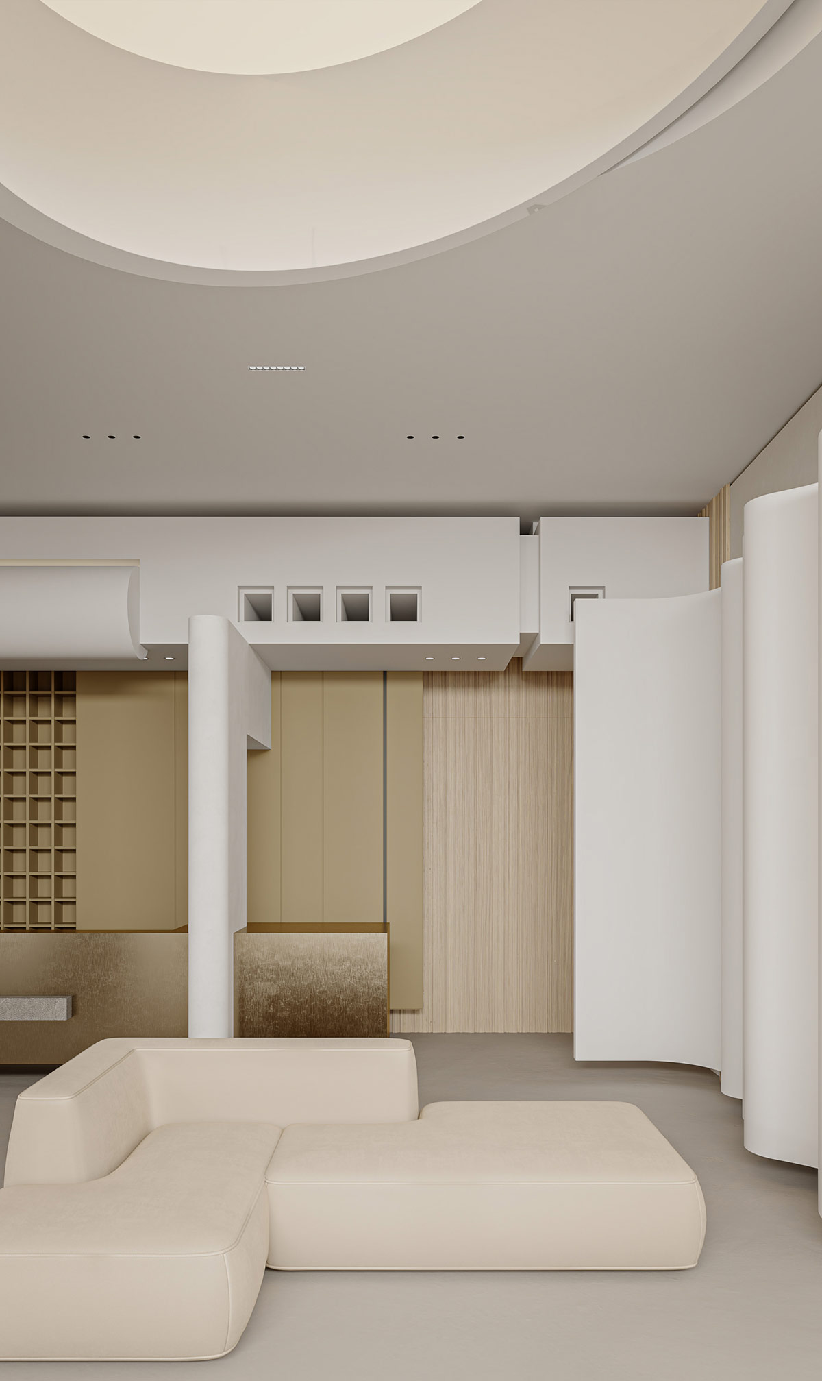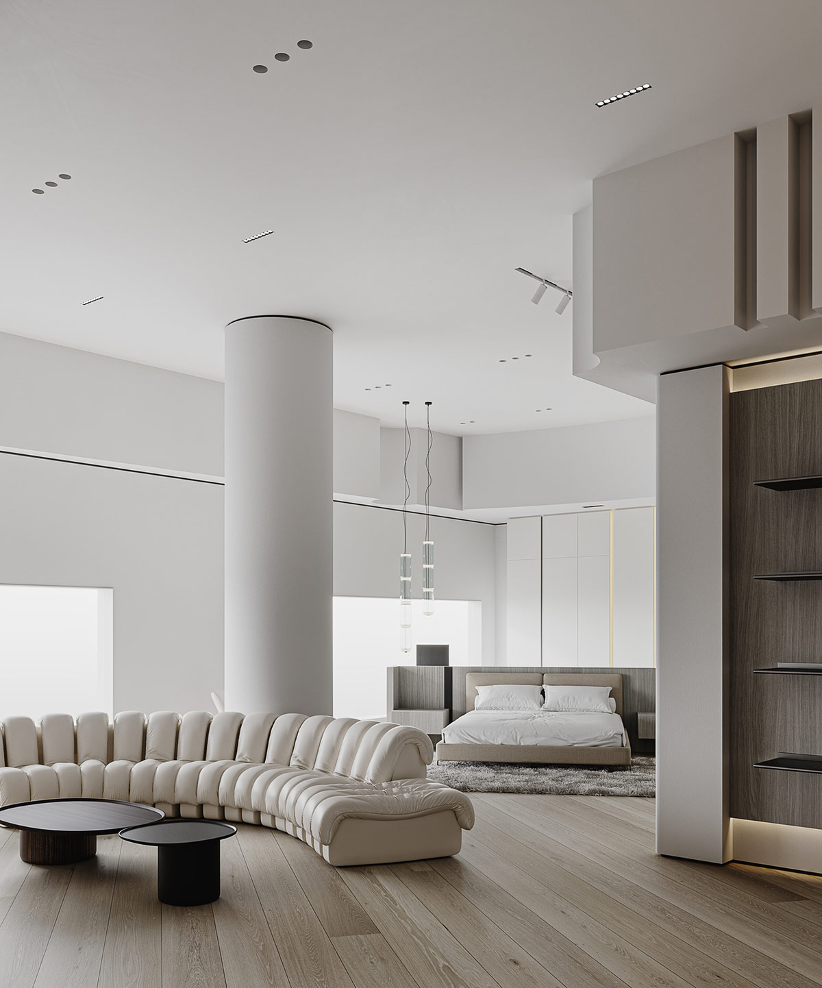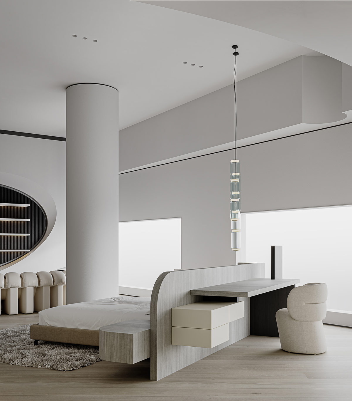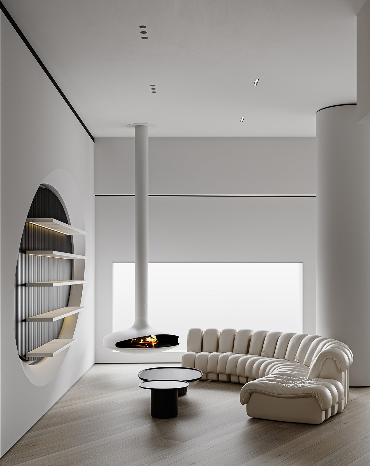 夢(mèng)幻般的家具為這個(gè)酷酷的奶油色內(nèi)飾帶來(lái)了形狀創(chuàng)意的精髓,由中國(guó)渲染師夢(mèng)太初形象化。雖然這里的裝飾主要是灰白的,但對(duì)比的時(shí)刻產(chǎn)生了清晰度和戲劇性。