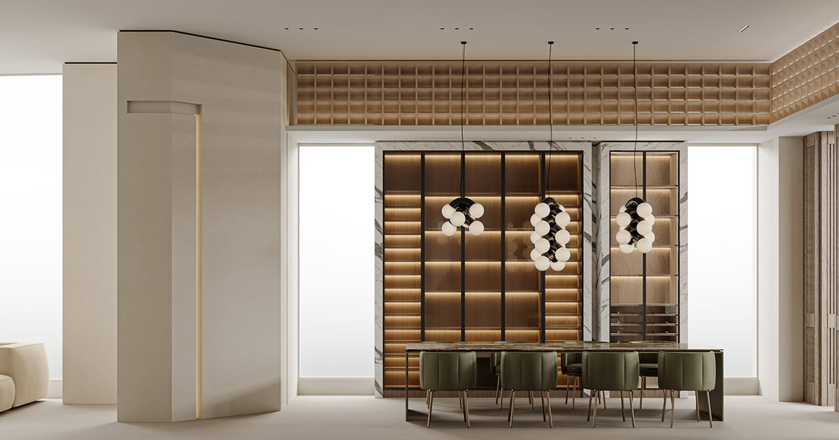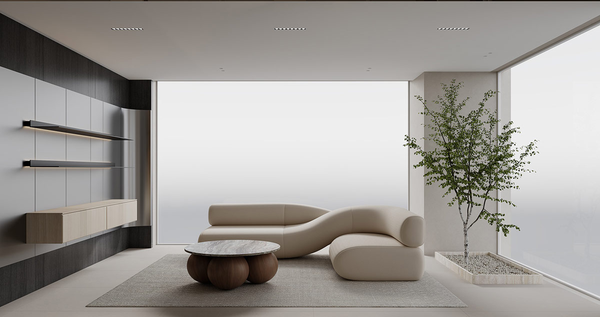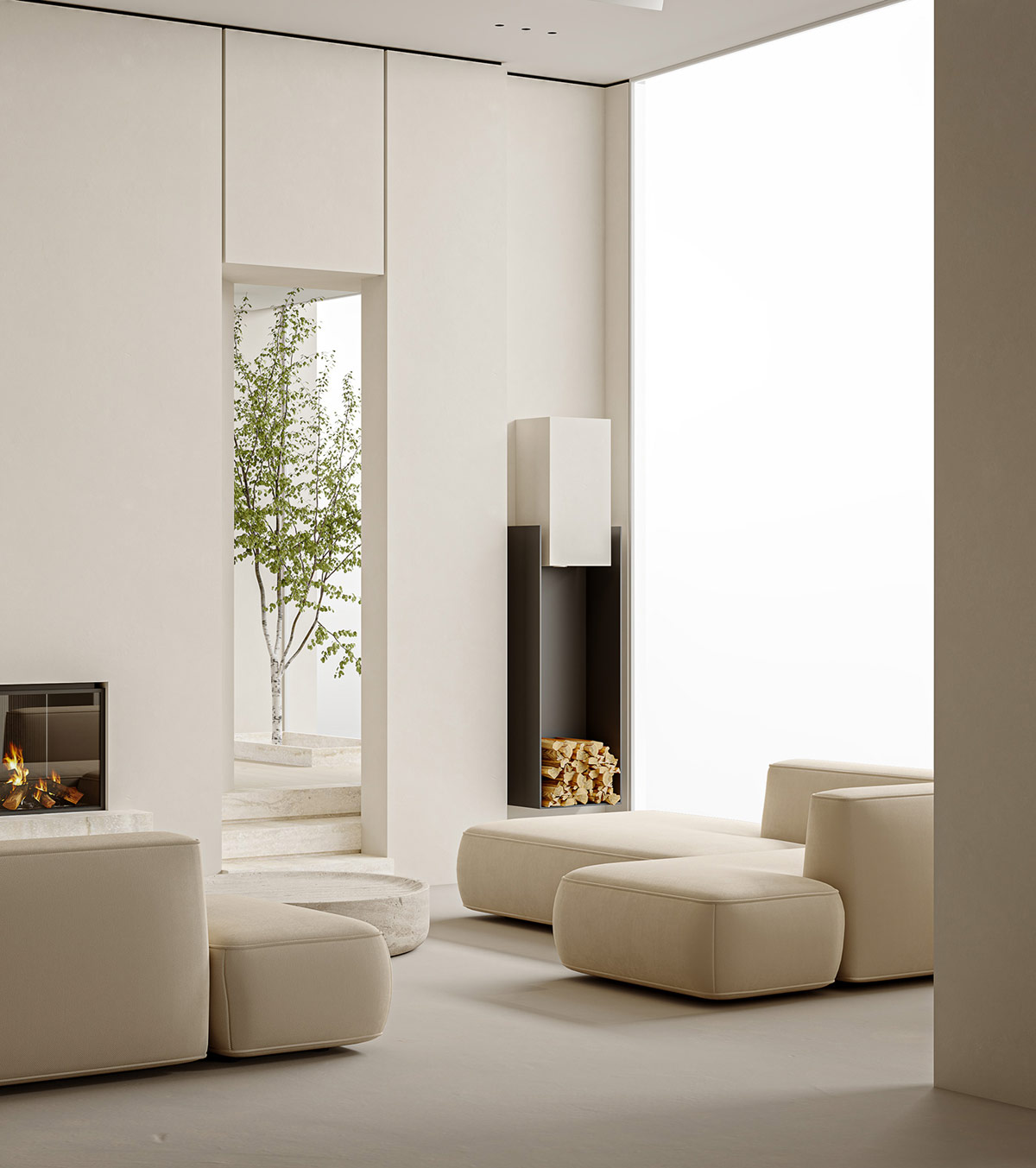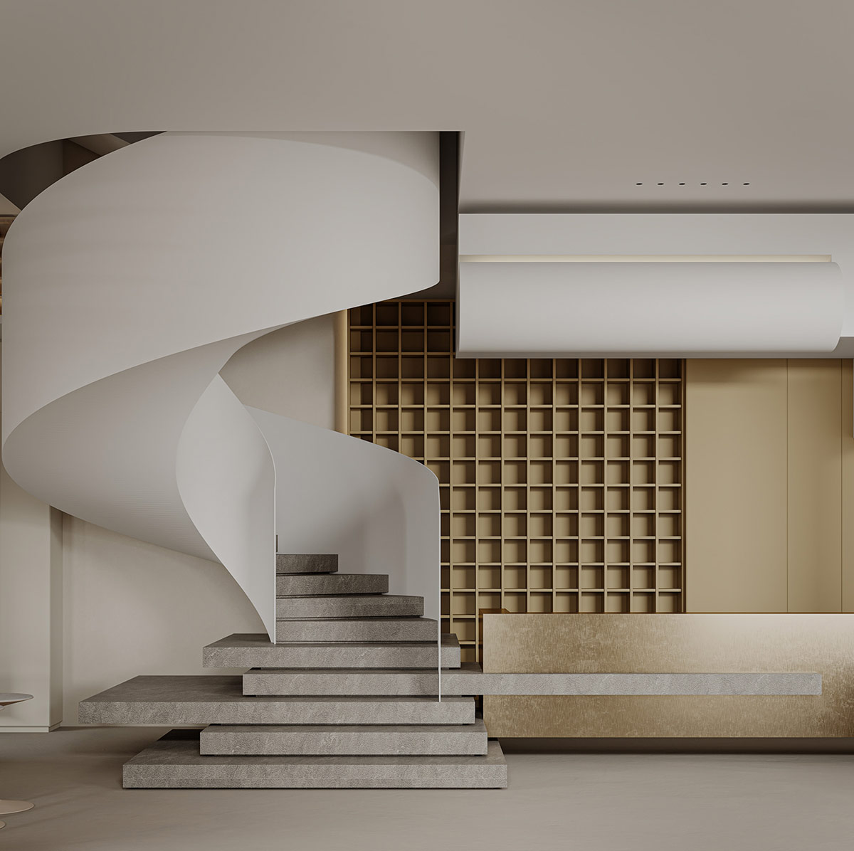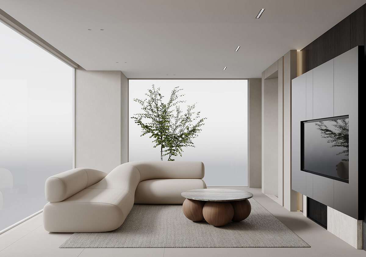 夢(mèng)幻般的家具為這個(gè)酷酷的奶油色內(nèi)飾帶來(lái)了形狀創(chuàng)意的精髓,由中國(guó)渲染師夢(mèng)太初形象化。雖然這里的裝飾主要是灰白的,但對(duì)比的時(shí)刻產(chǎn)生了清晰度和戲劇性。