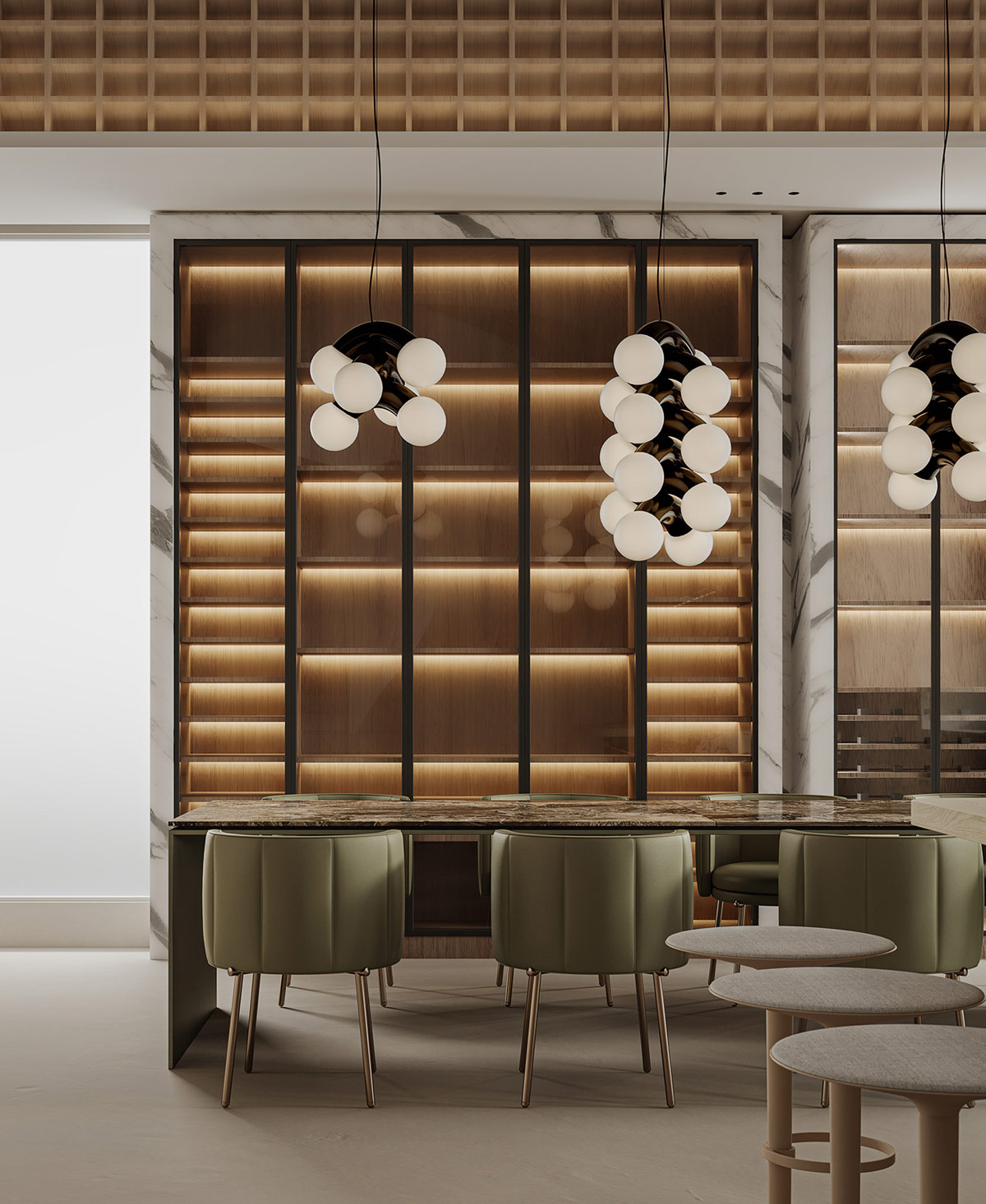 定制的內(nèi)置插件配有帶照明的擱架,可以展示裝飾性菜肴、藝術(shù)品和酒杯,為豪華餐廳提供支持?,F(xiàn)代吊燈是凱恩·海因茨曼 (Caine Heintzman) 為 ANDLight 設(shè)計(jì)的藤蔓分層吊燈。