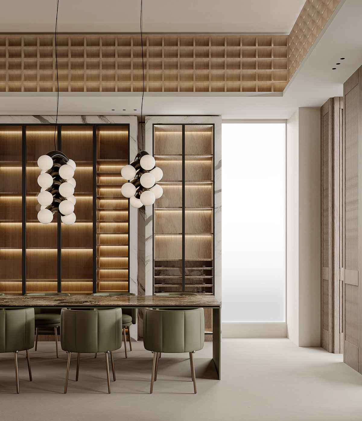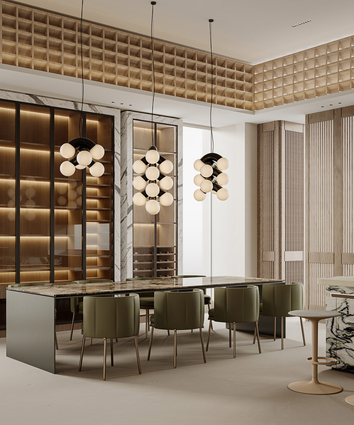現(xiàn)代線性懸掛燈照亮華麗的大理石島設(shè)計(jì)。綠色點(diǎn)綴在大理石飾面上旋轉(zhuǎn),與相鄰的餐椅形成微妙的色彩聯(lián)系。