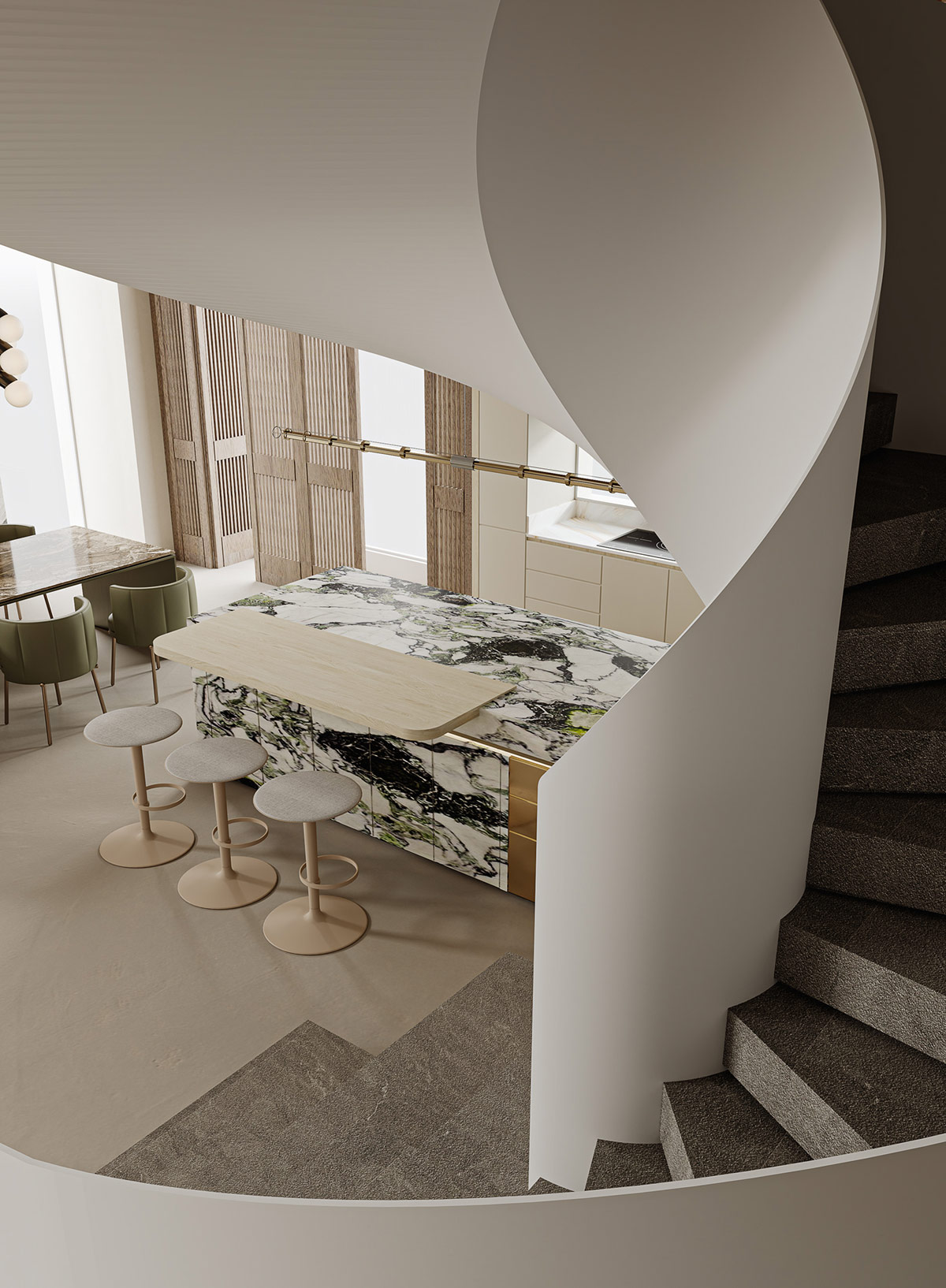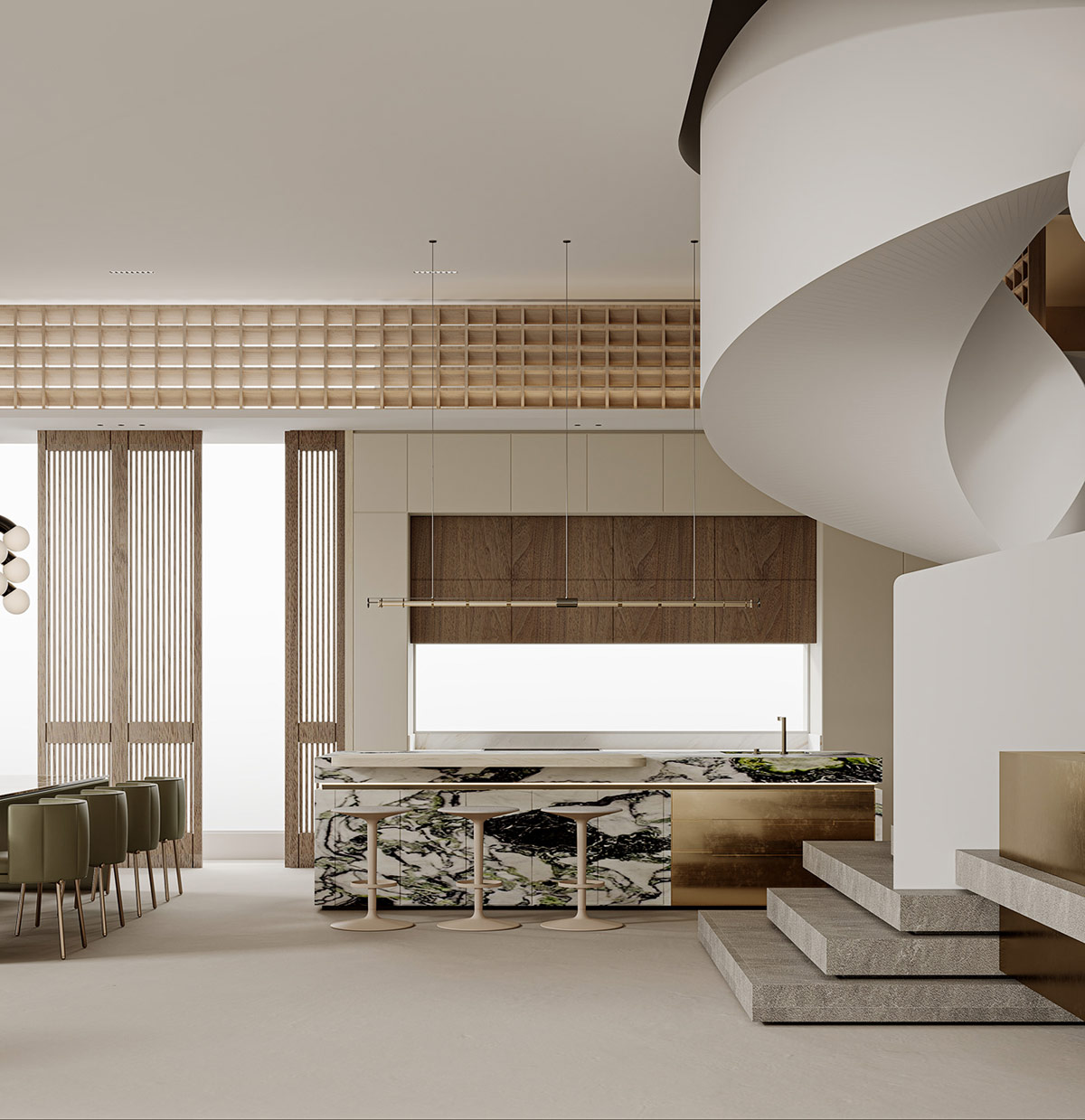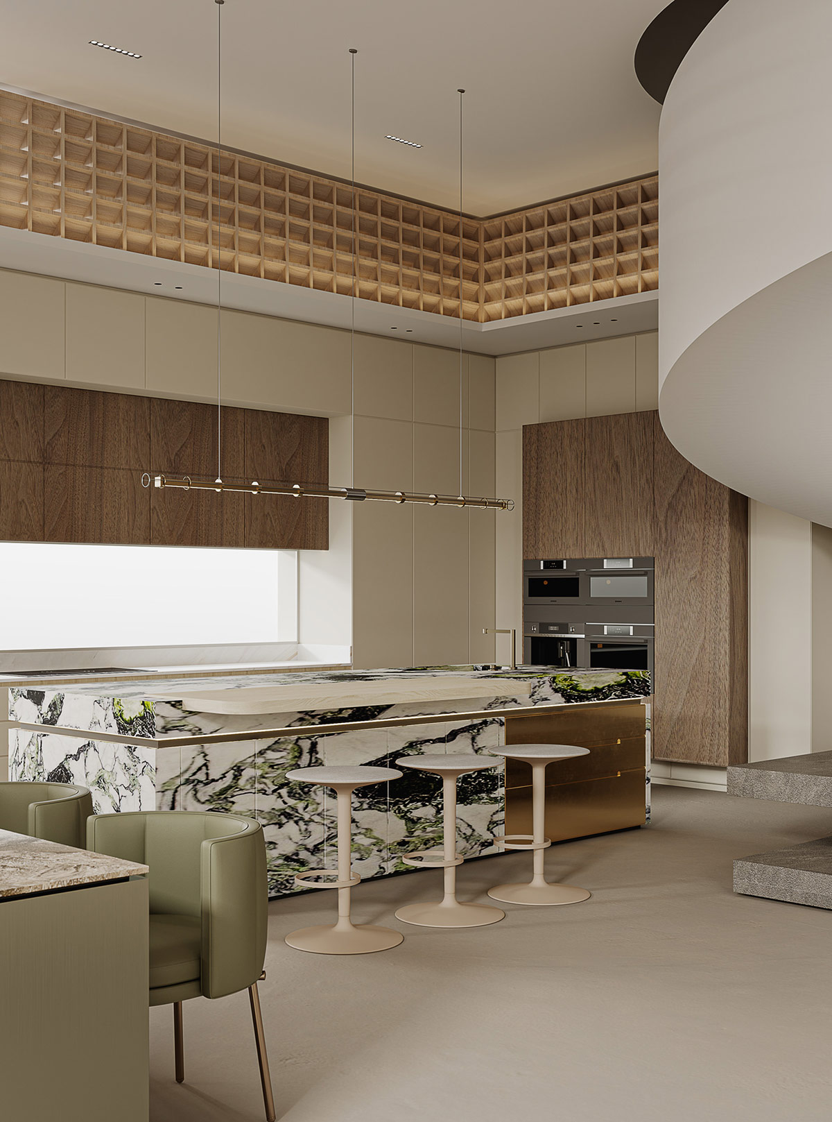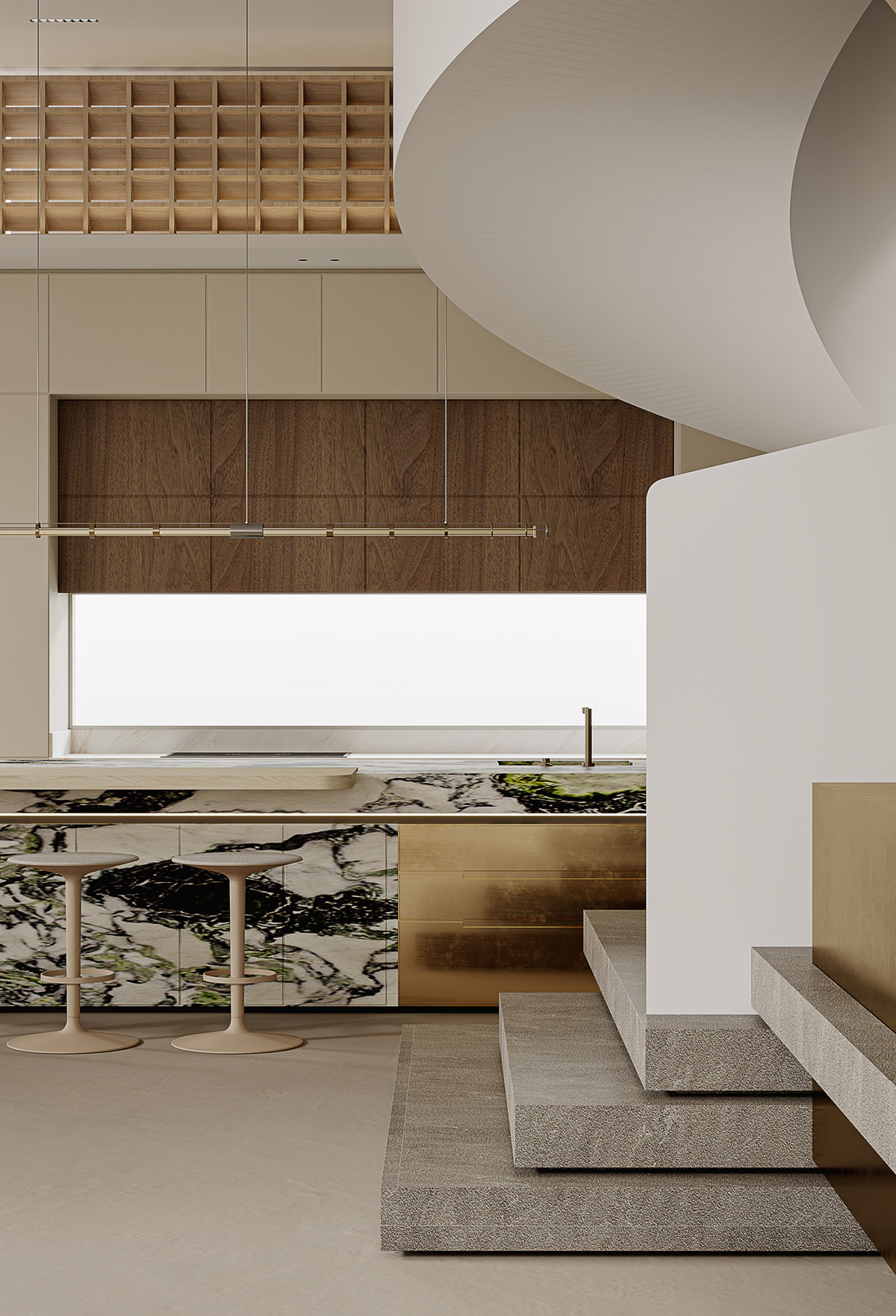 純奶油色單元輕輕地勾勒出廚房裝置的背面,胡桃木壁單元增添了豐富的核心。閃亮的金色抽屜單元突出了通往樓梯的獨(dú)特廚房島臺(tái)設(shè)計(jì)的盡頭。