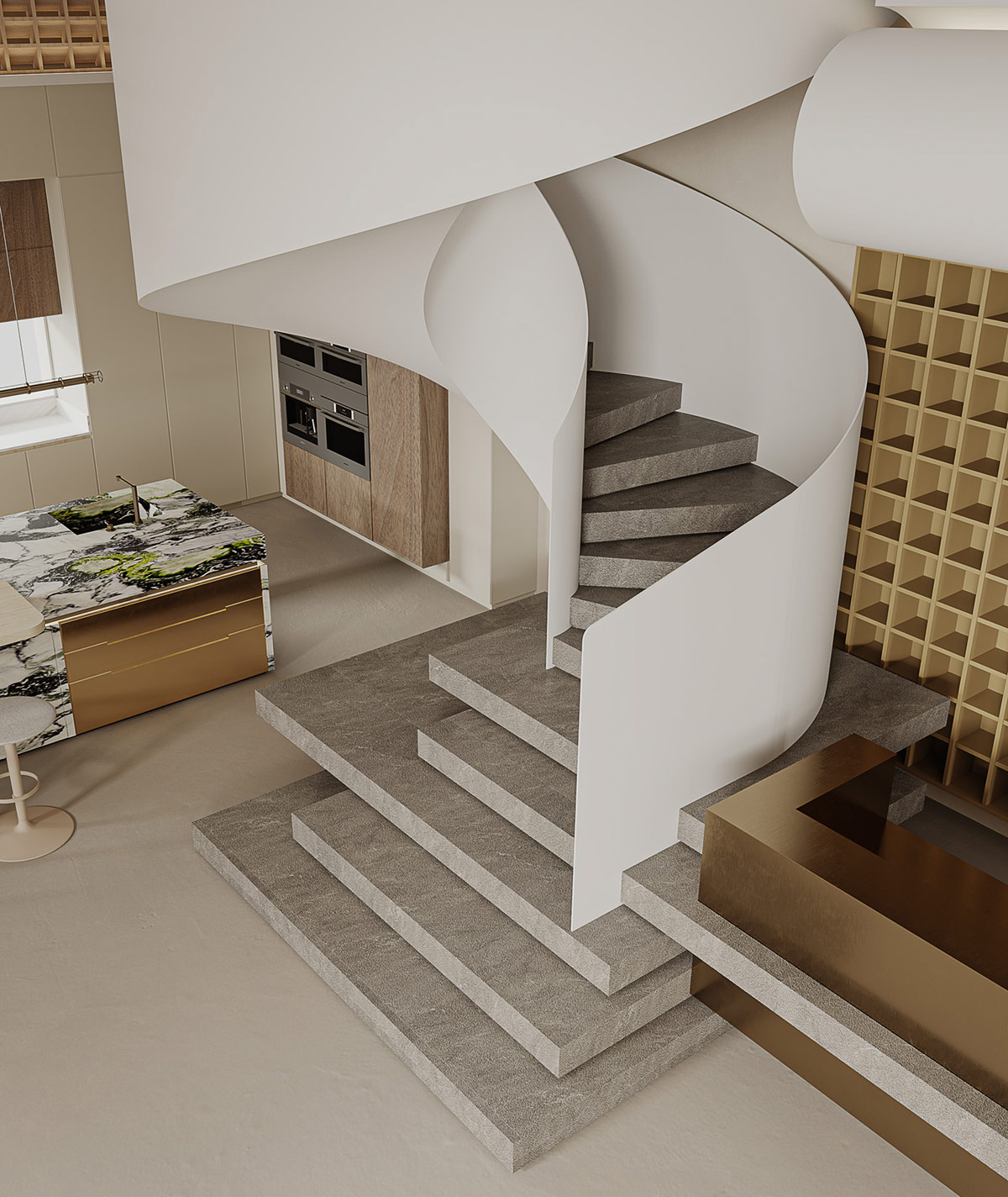 高高的天花板、寬敞的房間、精心制作的內(nèi)置插件和高端材料營(yíng)造出無(wú)可否認(rèn)的奢華感。精湛的螺旋樓梯設(shè)計(jì)穿過(guò)豪華的起居空間,錯(cuò)落有致的實(shí)心混凝土踏板和雕塑般的旋轉(zhuǎn)欄桿展現(xiàn)出非凡的效果。