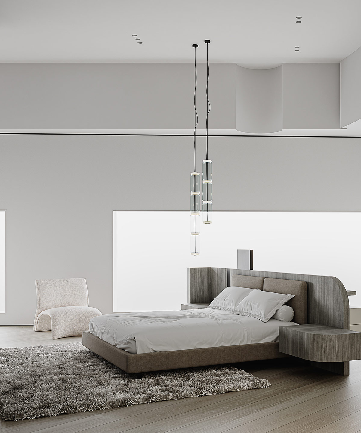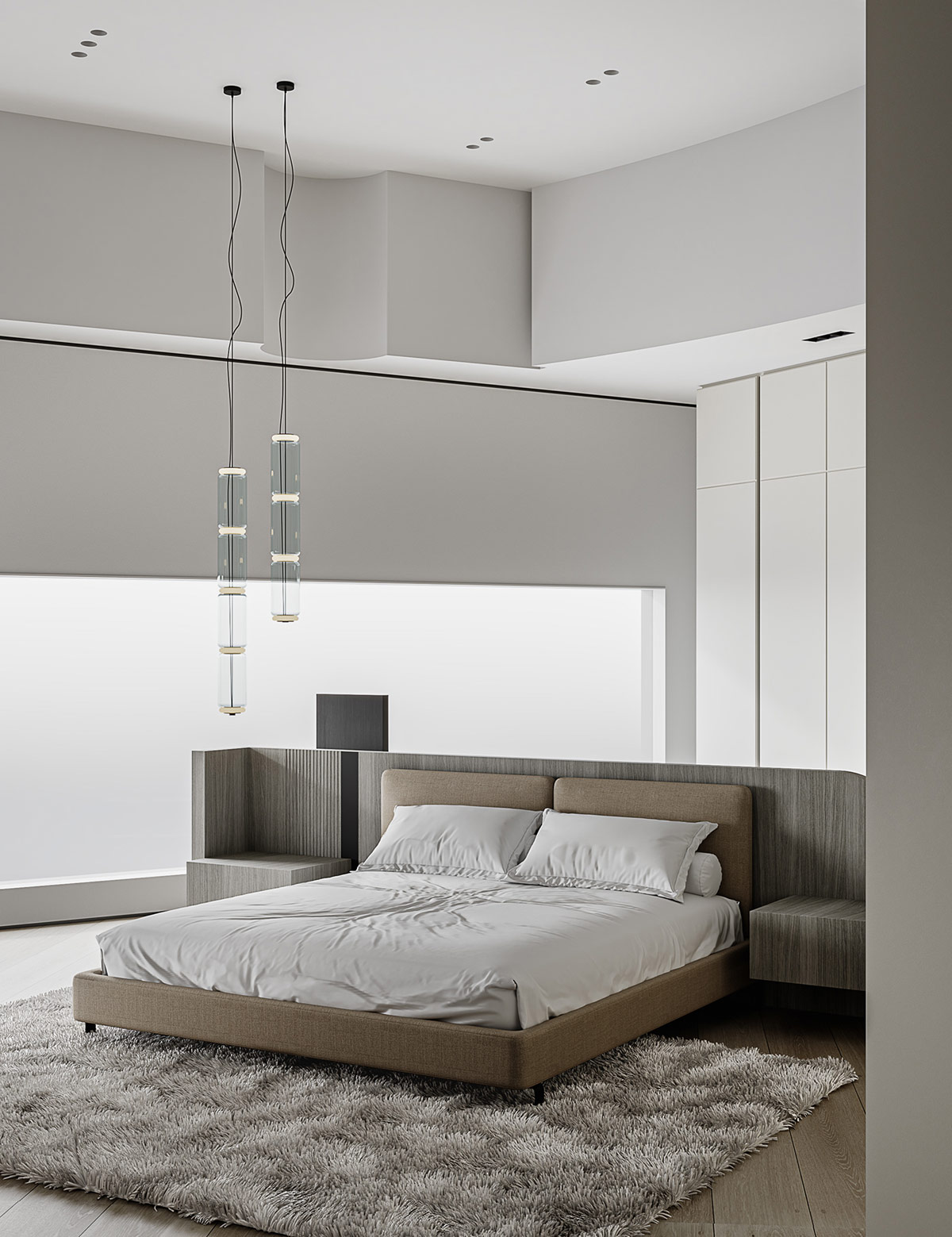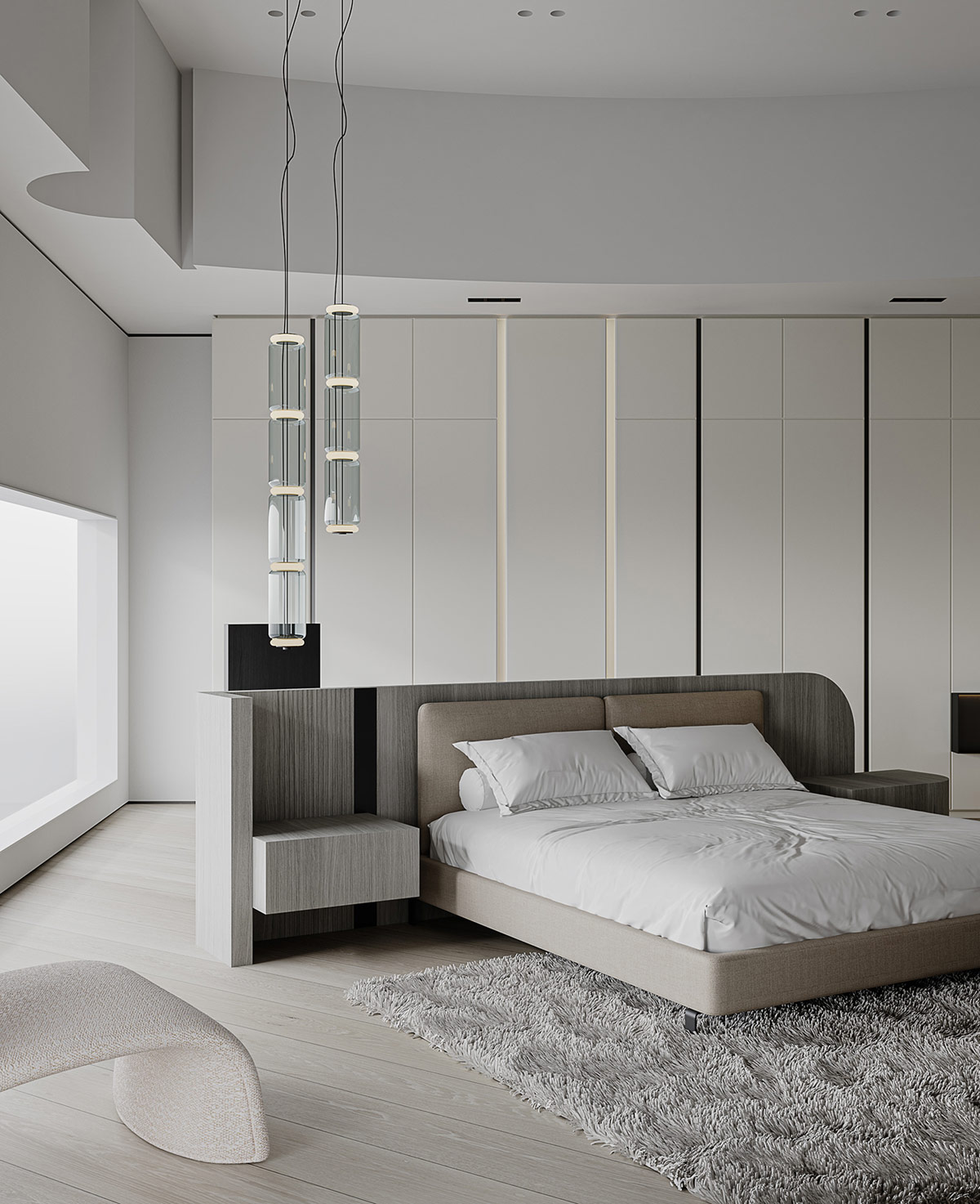 兩盞現(xiàn)代玻璃臥室吊燈從床的一側(cè)下降,白天它們也很吸引人地從窗戶(hù)捕捉自然光。