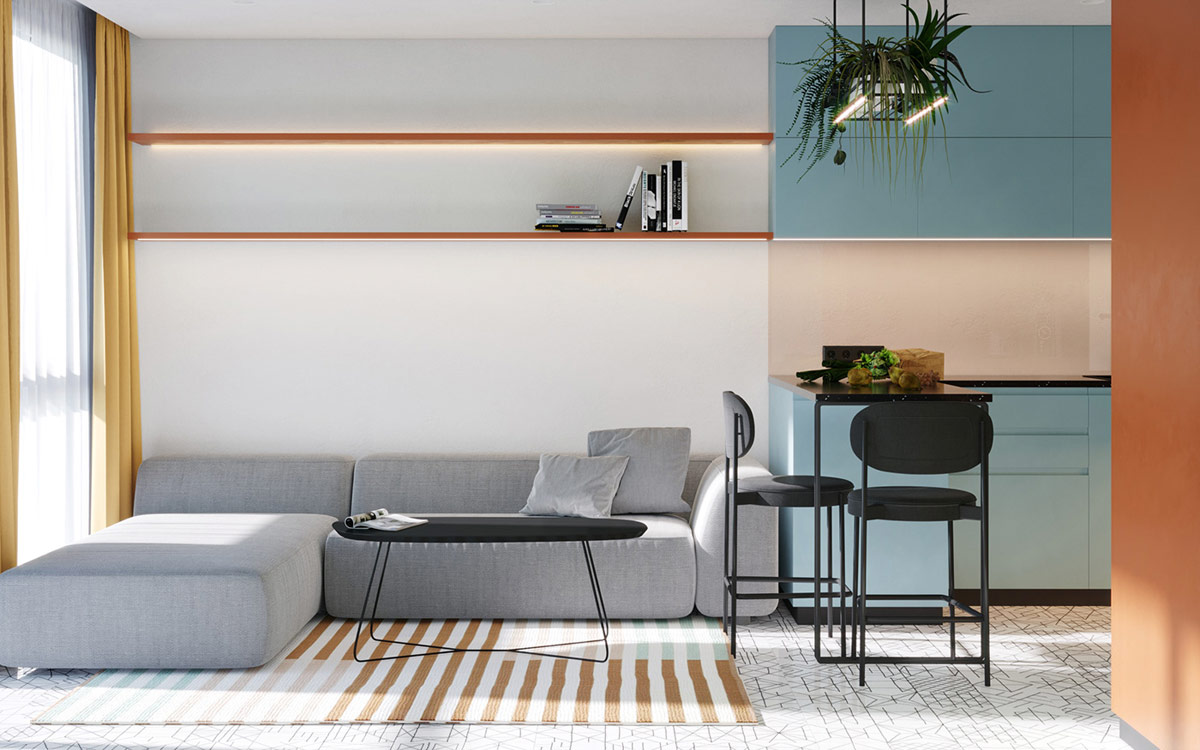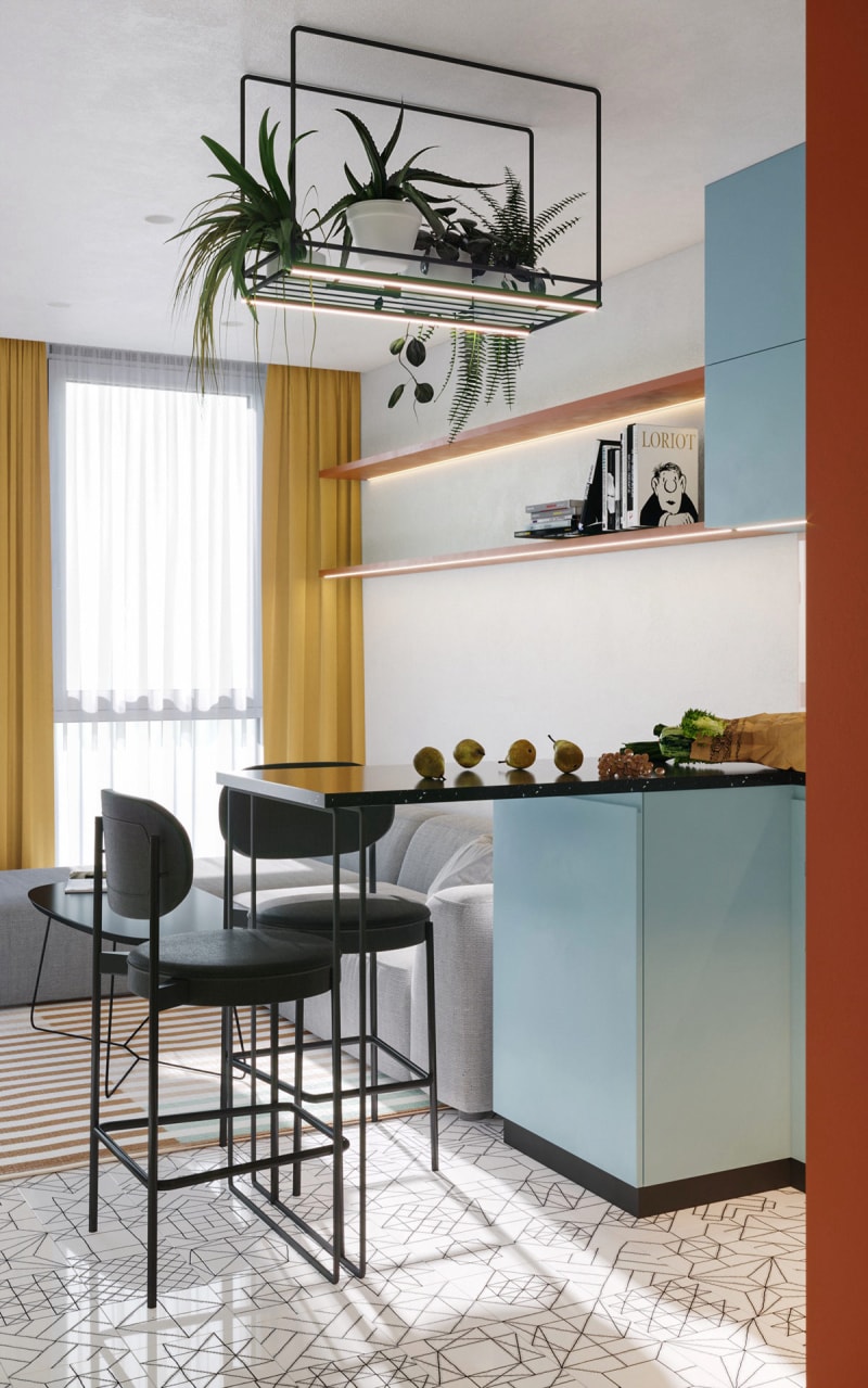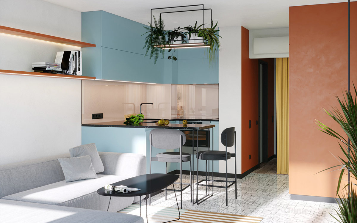 涼爽的天藍(lán)色櫥柜在小型開放式客廳角落勾勒出廚房布置。微風(fēng)輕拂的顏色將烹飪區(qū)和緊湊的用餐半島區(qū)分開來。