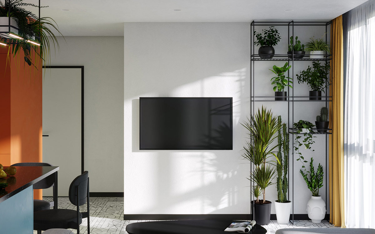 大量的室內(nèi)植物被布置在一個(gè)黑色的線框擱架單元上,位于窗戶旁邊,以確保它們獲得充足的陽光。這些植物在平坦的白色電視墻上長出一種有吸引力的紋理特征。