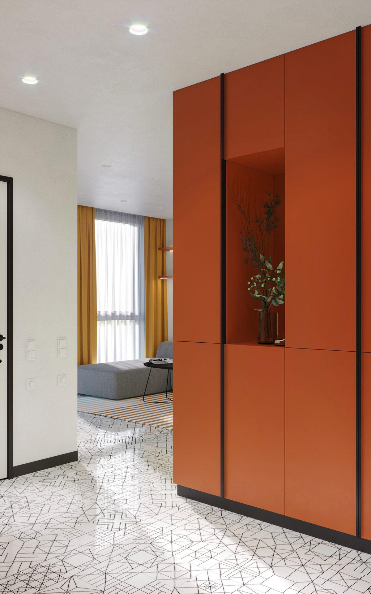 深橙色的單元在家庭入口處營造出熱烈而充滿活力的歡迎。