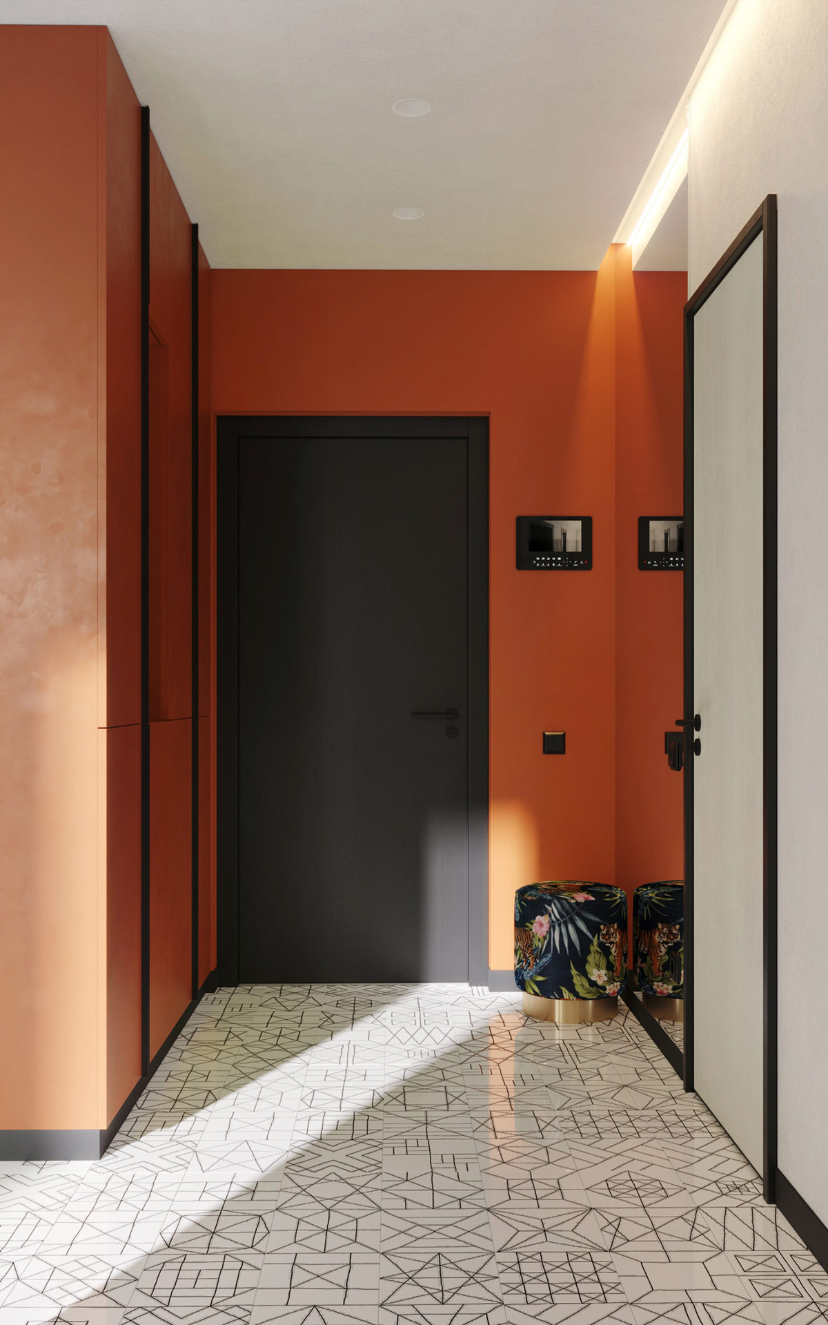 橙色的口音滲透到對(duì)比鮮明的黑色前門周圍的油漆中?;ǖ试谇度胧街苓呎彰飨陆Y(jié)合了明亮和黑暗的音符。全身無框鏡子營造出增加空間的錯(cuò)覺。