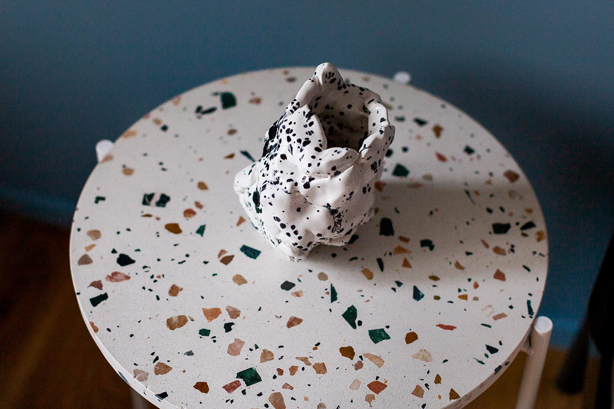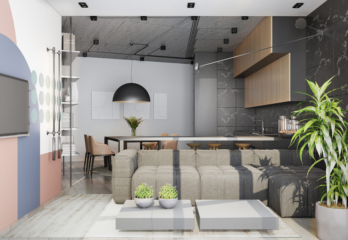 平靜的灰色基色錨定了我們下一個(gè)色彩繽紛的家居內(nèi)飾。一張溫暖的灰色簇絨沙發(fā)伸展在兩張混凝土方形咖啡桌后面。混凝土花盆給矮桌增加了一點(diǎn)高度。