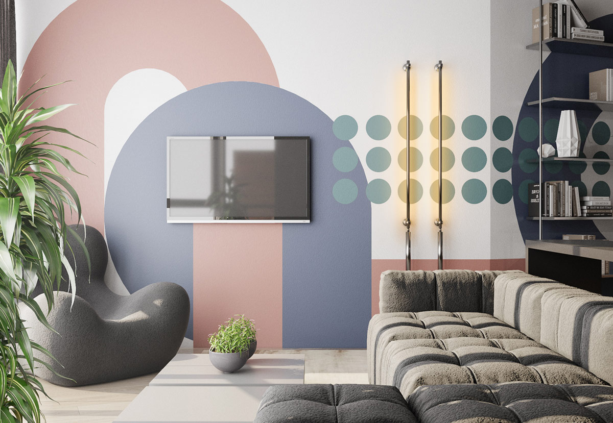 鼓舞人心的電視墻充滿了色彩和藝術(shù)圖形壁畫。藍(lán)色、紅色和青色的油漆效果為壁掛式電視屏幕創(chuàng)造了一個(gè)有趣的支架,并為一對(duì)現(xiàn)代壁燈繪制了歡樂的背景。