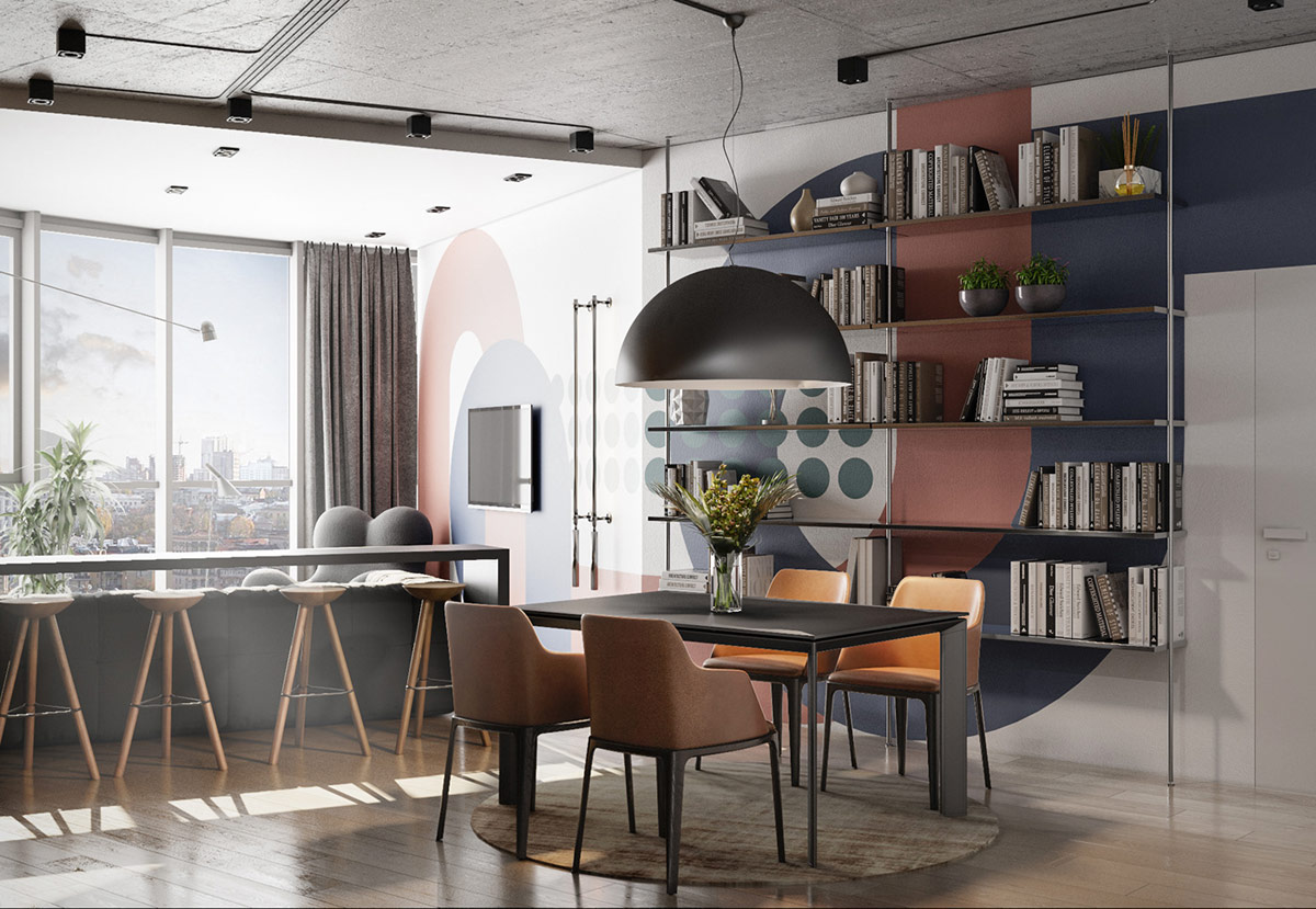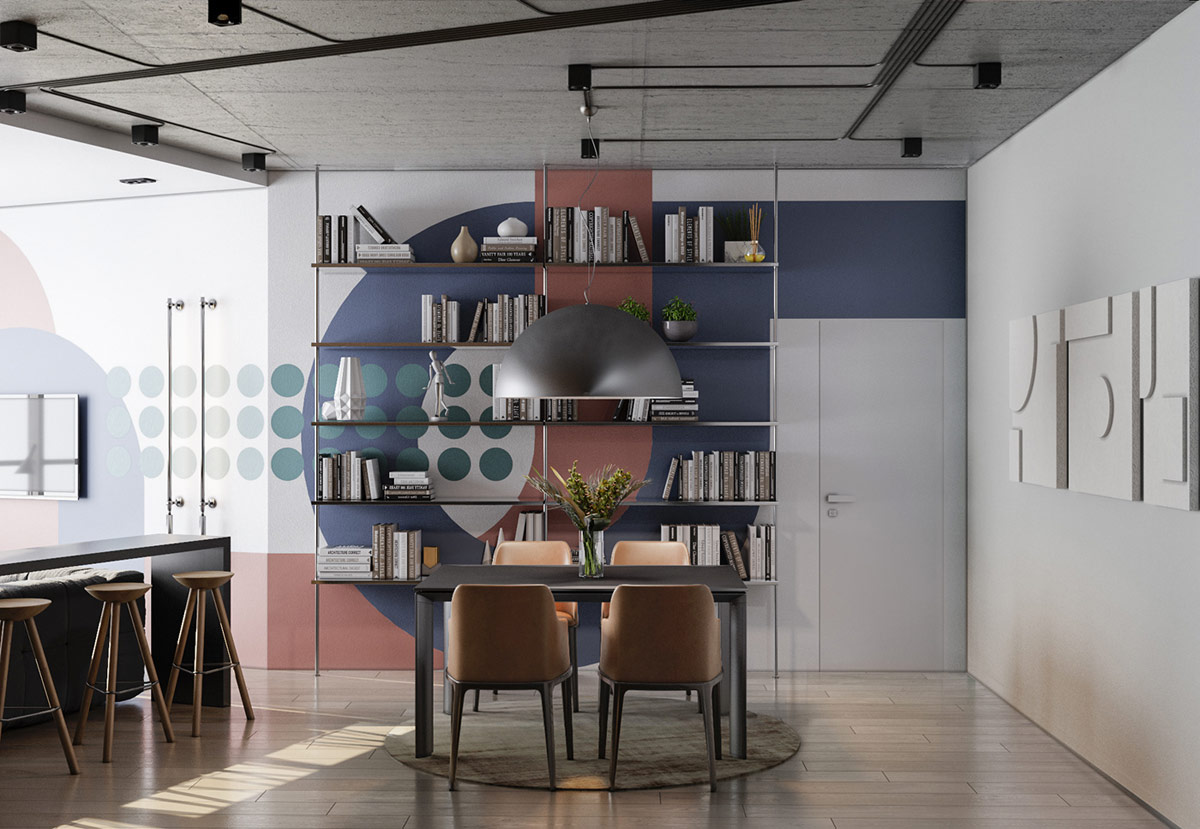 五顏六色的圖形在用餐區(qū)繼續(xù)存在,在那里它們成為一個(gè)令人難以置信的背景,用于從地板到天花板的拉緊書柜。超大的餐廳吊燈與壁畫曲線相得益彰。