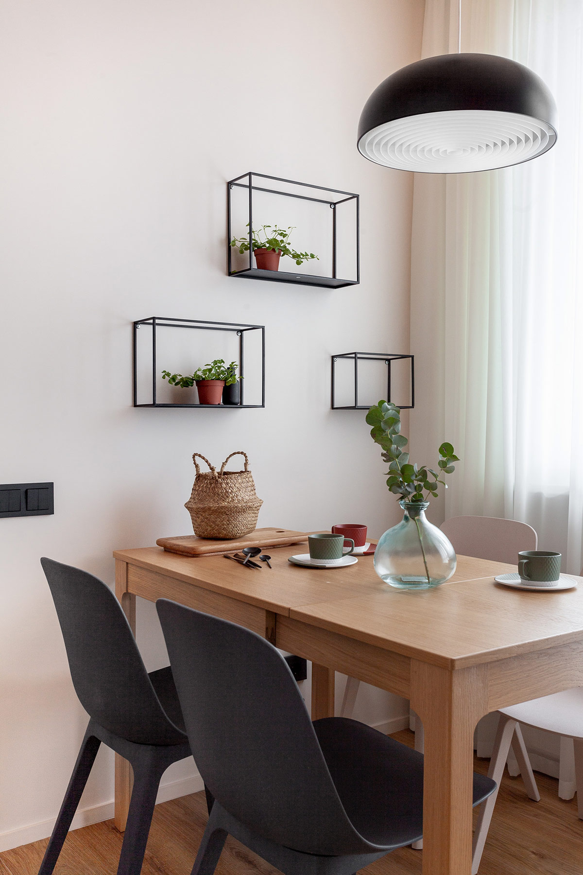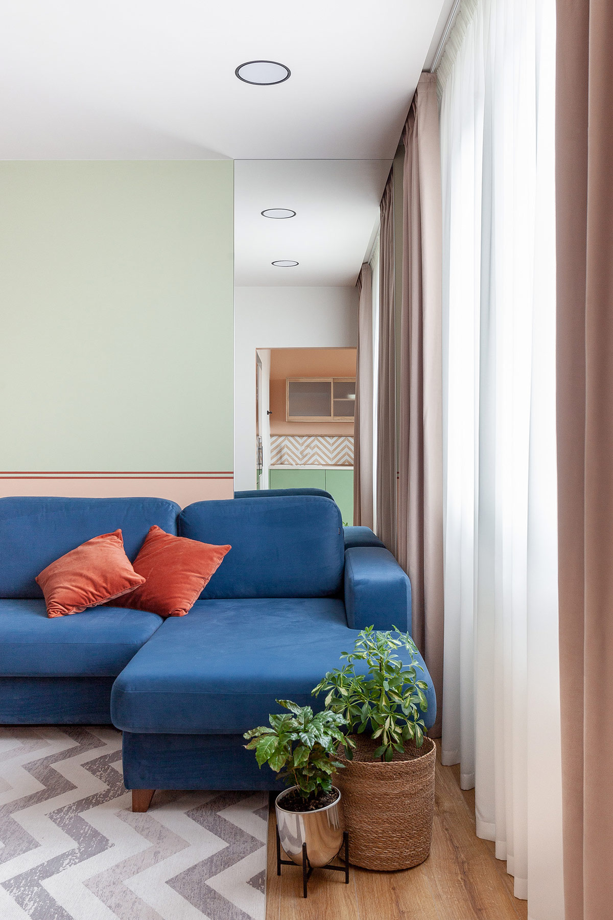 莫斯科這座色彩繽紛的公寓采用藍(lán)色、綠色和橙色的對(duì)比色打造而成。木地板和獨(dú)特的花盆帶來柔和的自然色調(diào)。