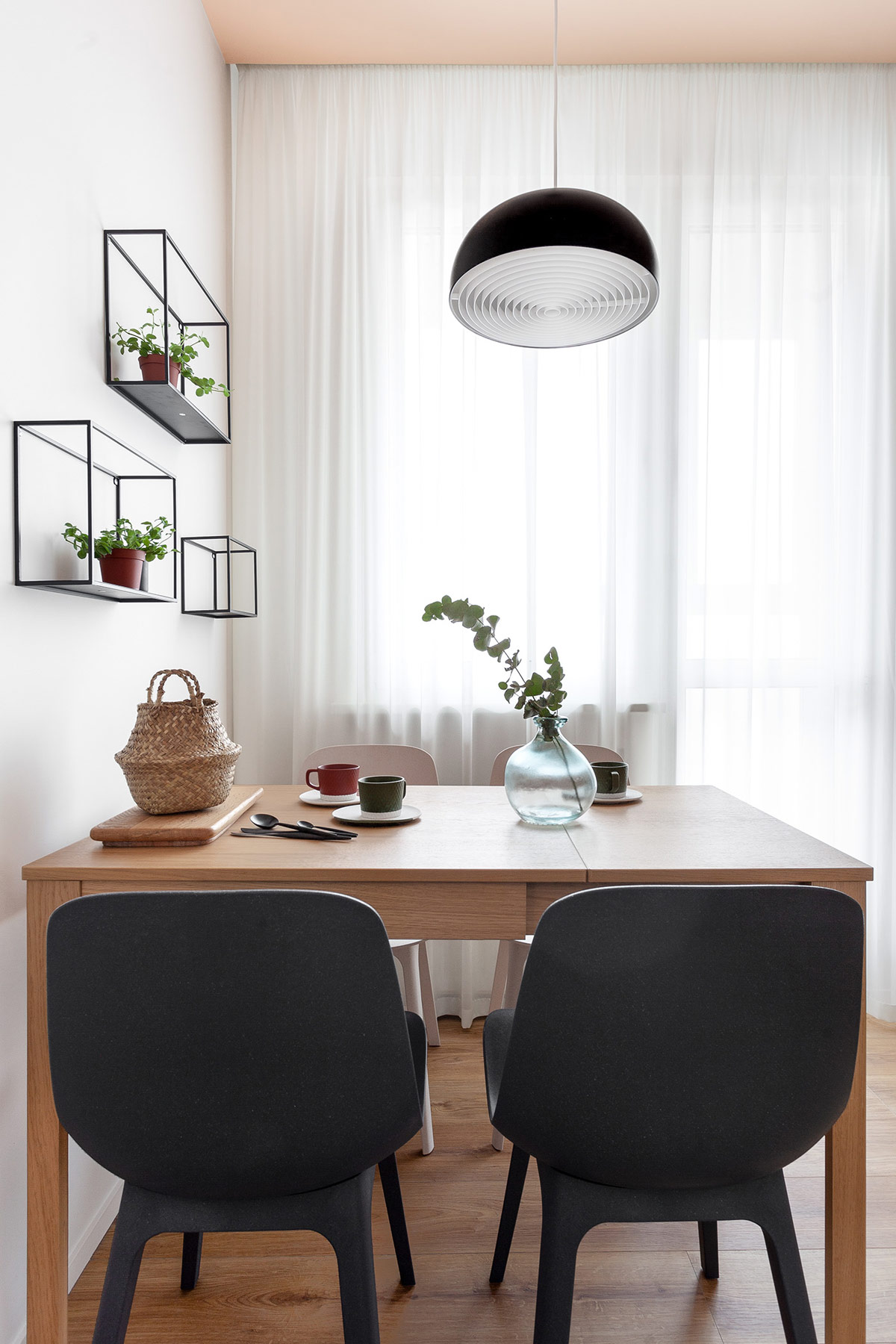 黑色廚房吧臺(tái)凳與光滑的黑色廚房臺(tái)面和相鄰休息區(qū)的咖啡桌相協(xié)調(diào)。工業(yè)線框燈和儲(chǔ)物架將黑色調(diào)帶到天花板上,為更有吸引力的綠色樹葉創(chuàng)造一個(gè)節(jié)省空間的家。