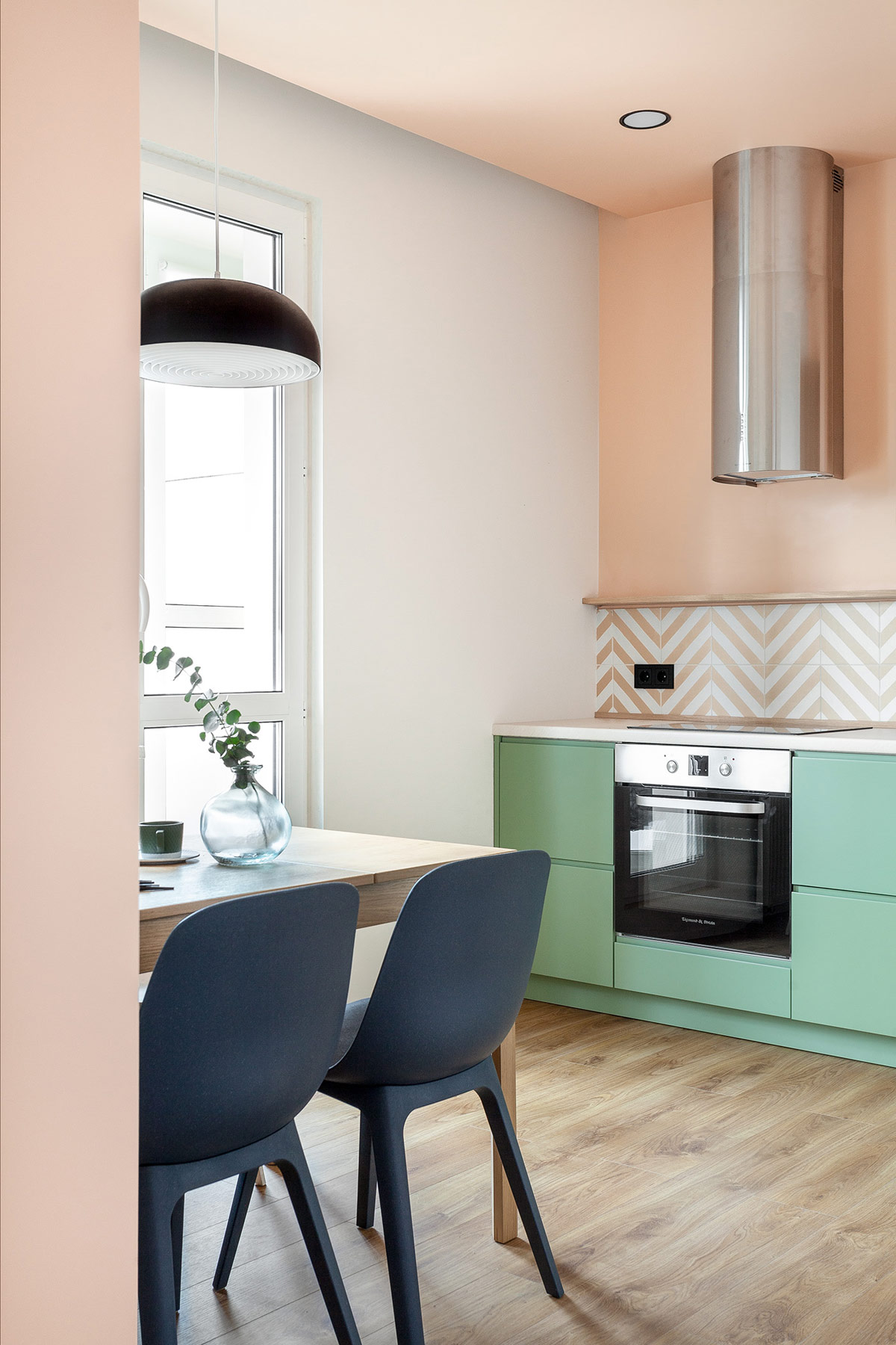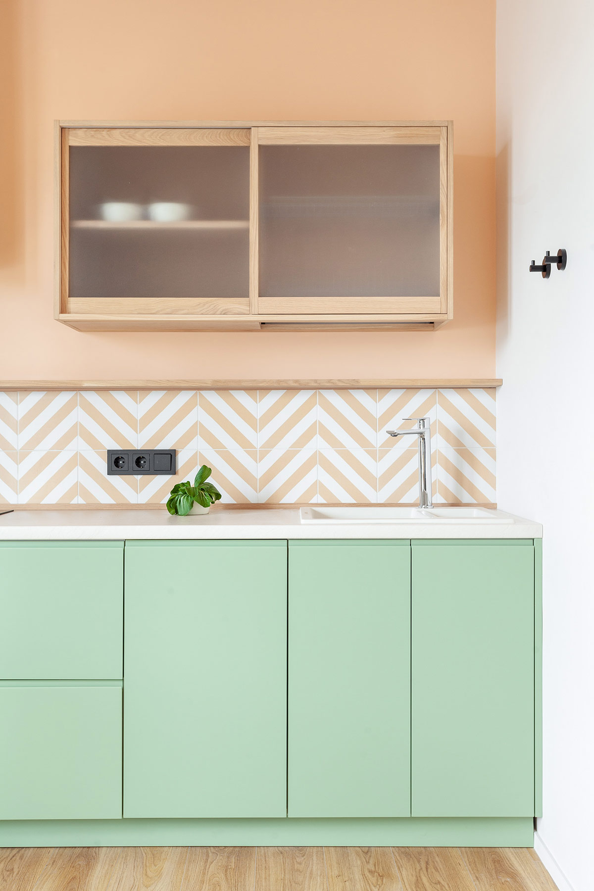淺綠色廚柜與杏色 V 形后擋板形成鮮明對(duì)比。木質(zhì)色調(diào)的壁柜與溫暖的杏色墻漆融為一體。