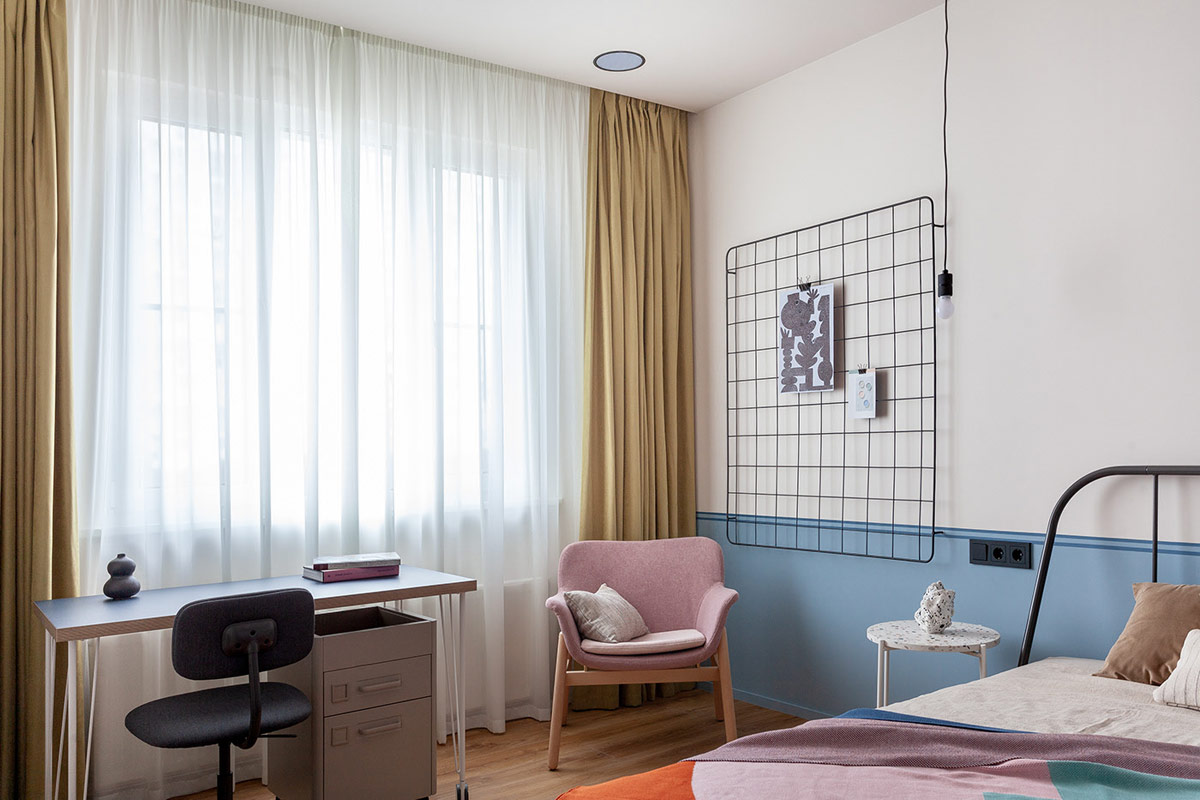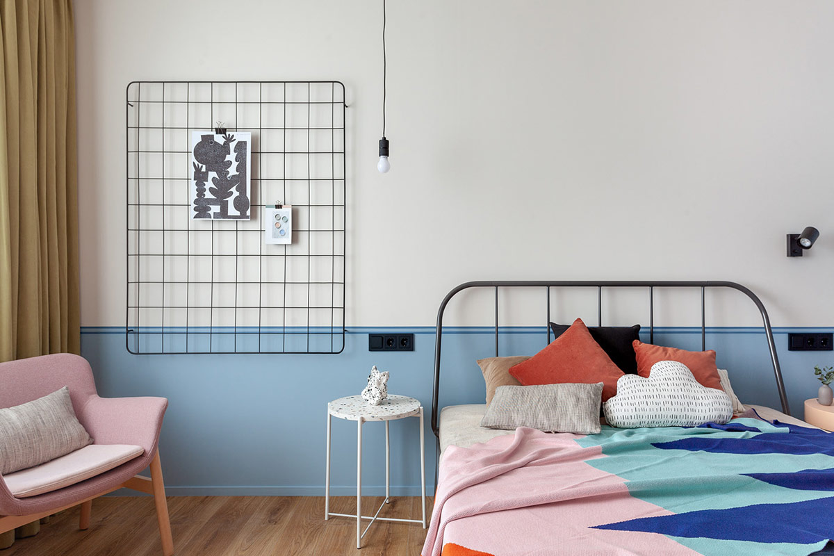 在臥室內(nèi),一條天藍(lán)色的水平色塊將明亮的圖案裝飾方案結(jié)合在一起。
