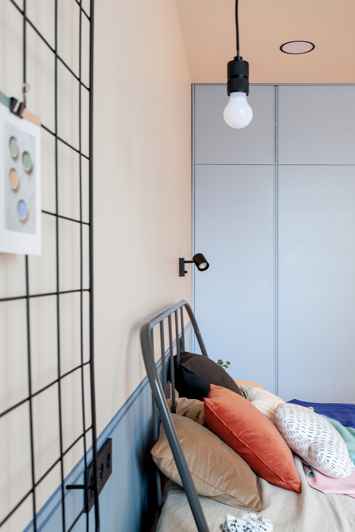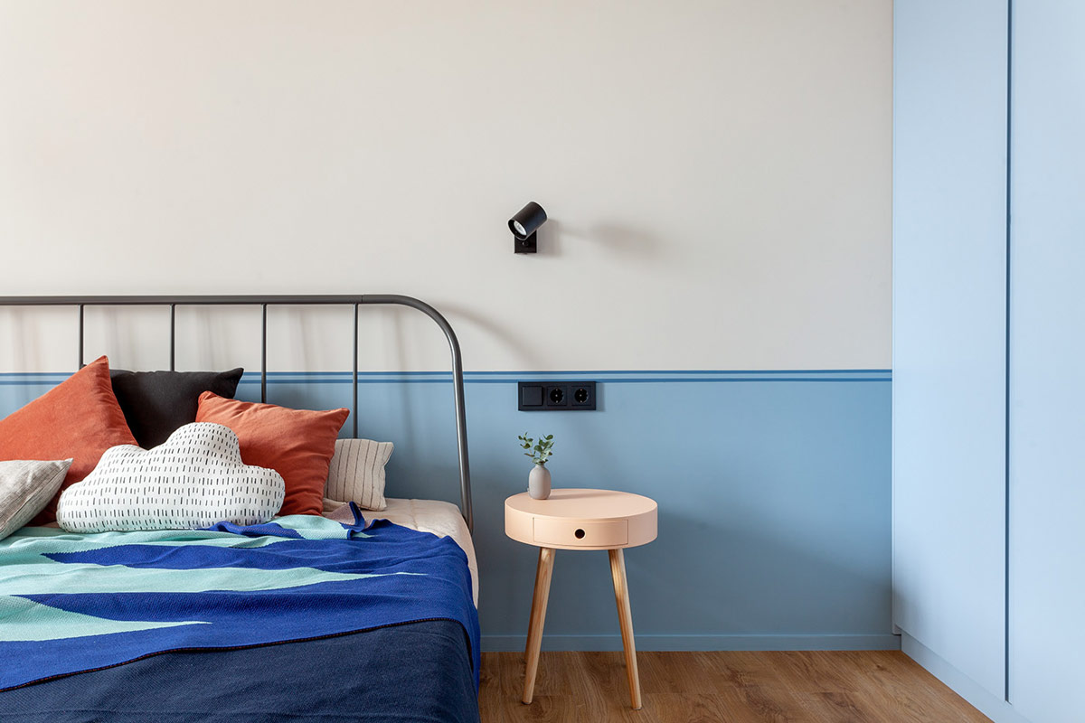 Scandi 風(fēng)格的床頭柜在藍(lán)色色塊面板前呈現(xiàn)出淺紅色。合身的衣柜將藍(lán)色口音包裹在相鄰的墻壁上。