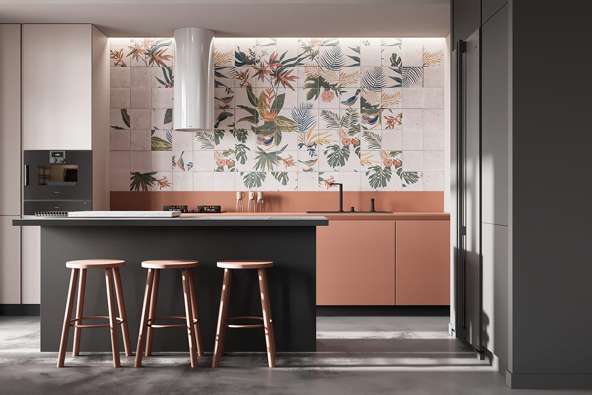 植物瓷磚在廚房的后墻上制作了一幅現(xiàn)代解構(gòu)壁畫。
