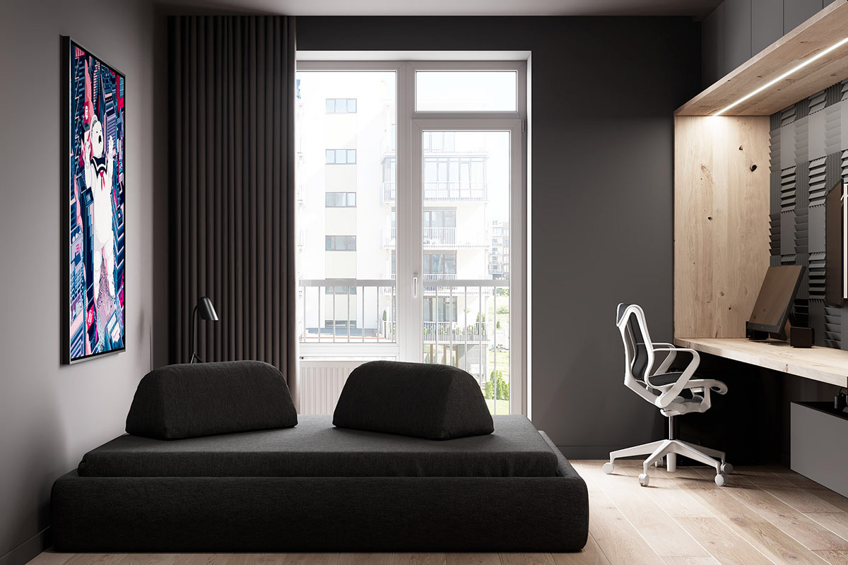 深灰色的臥室方案通過生動(dòng)的口音作品充滿活力。令人敬畏的捉鬼敢死隊(duì)版畫名為City byNVM Illustration。