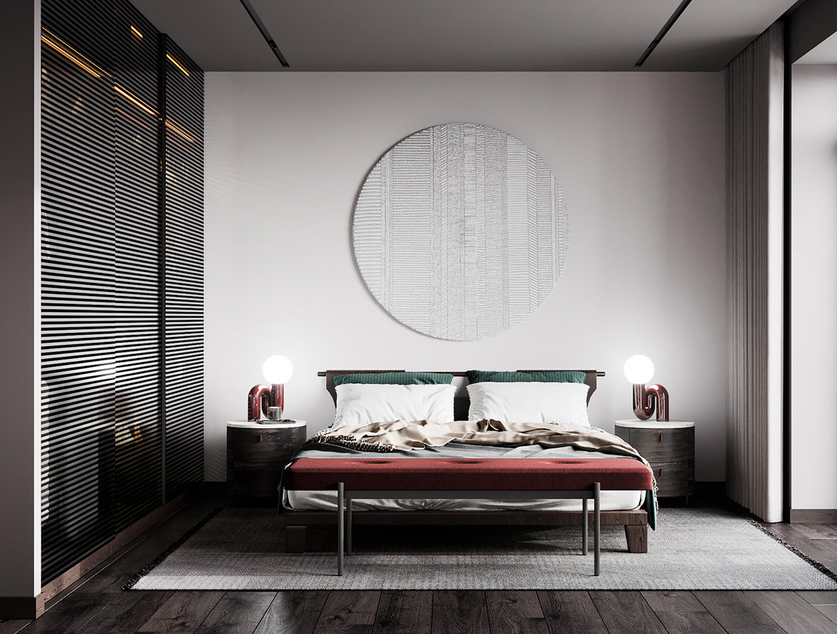 在第二間臥室,床邊長凳的一端帶有紅色調(diào)。綠色枕頭形成對(duì)比。