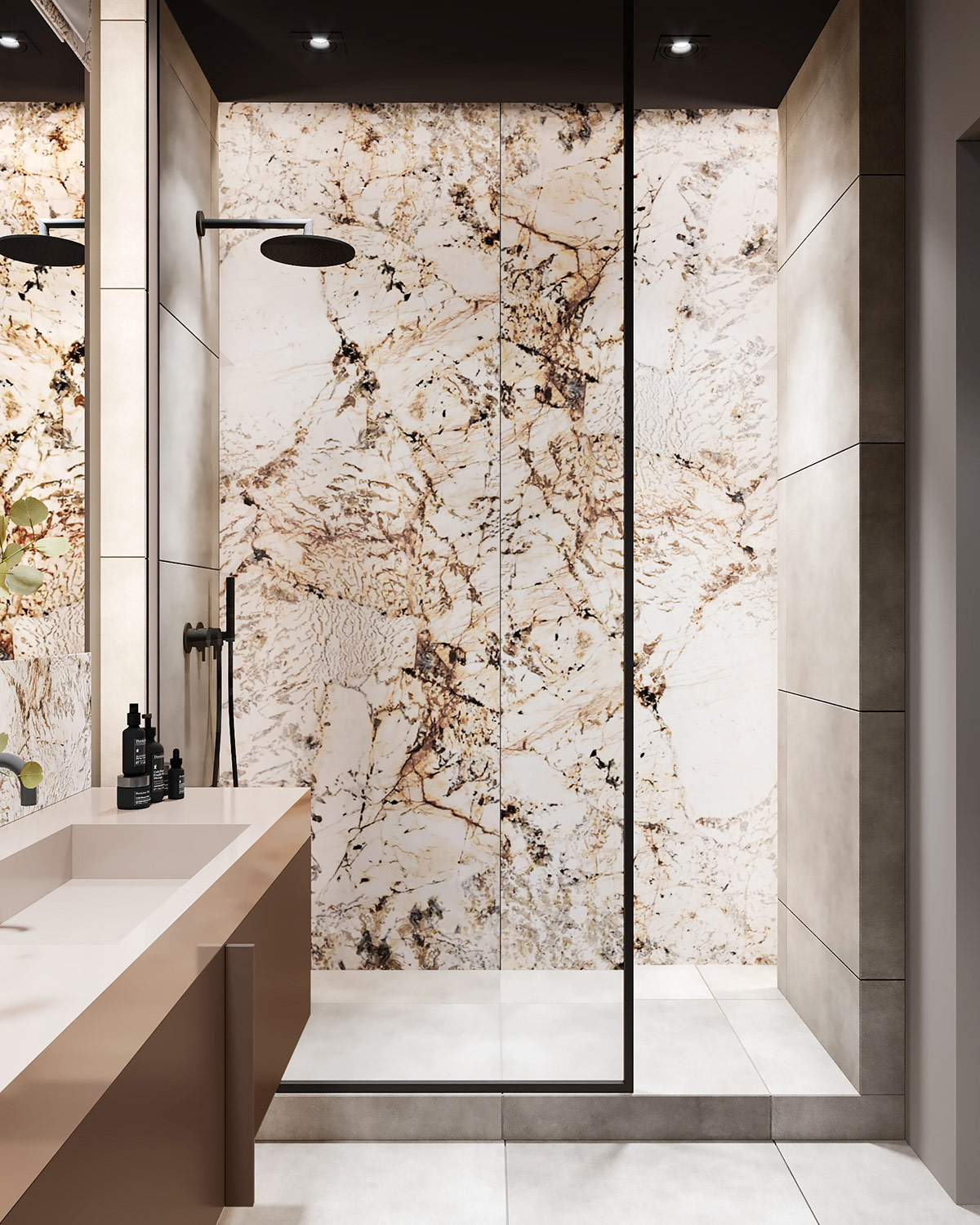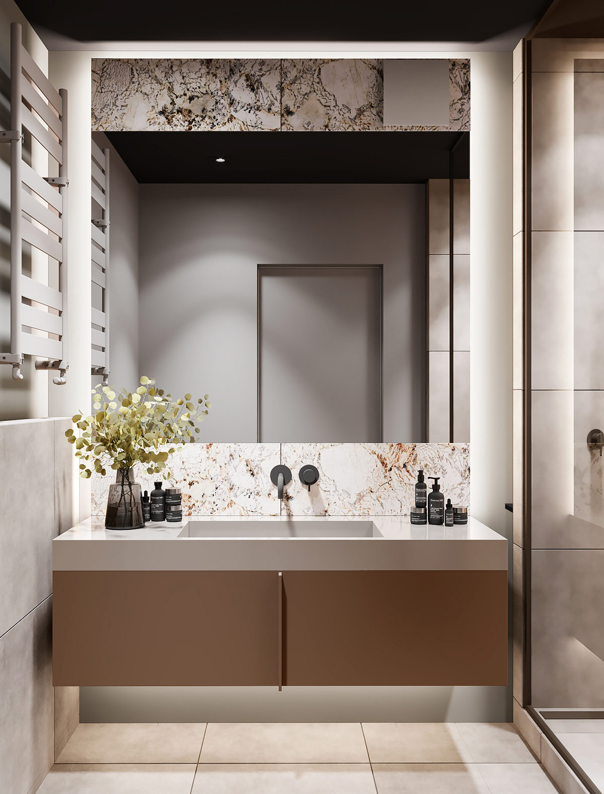 浴室融合了現(xiàn)代中性元素,配有奢華的大理石和銅色的現(xiàn)代浴室梳妝臺(tái)。