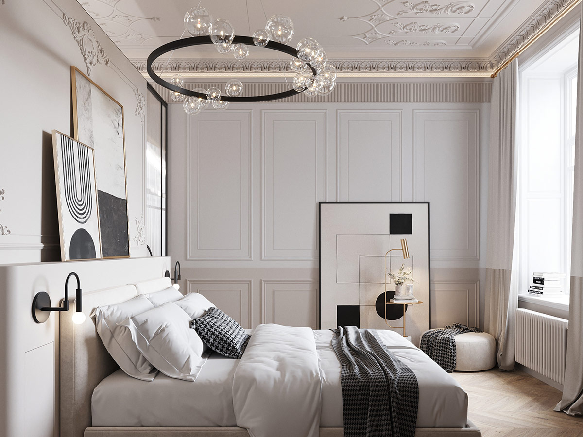 臥室是新古典主義室內(nèi)設(shè)計(jì)的一個(gè)壯觀例子,擁有迷人的裝飾灰泥天花板、經(jīng)典的皇冠造型和漂亮的床頭板墻。現(xiàn)代玻璃壁櫥門(mén)增加了令人難以置信的空間感、光線(xiàn)和宏偉感。