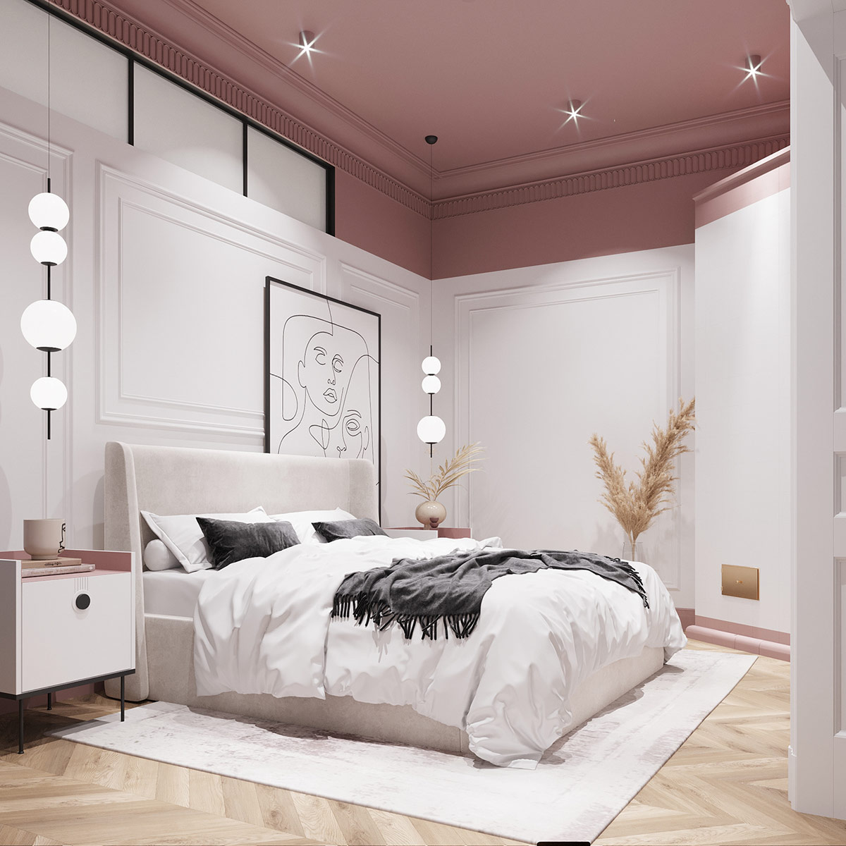 繼續(xù)進(jìn)入房子的第二間臥室,我們發(fā)現(xiàn)自己在一個(gè)舒適的粉紅色天花板下。大面積的地毯使地板保持明亮。