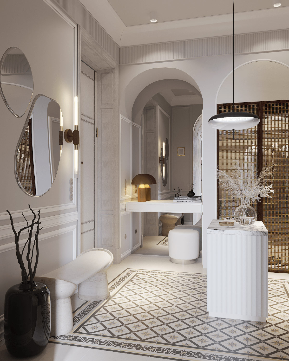入口島是多個(gè)拱形特征之間的宏偉中心。定制切割的鏡子填滿了一個(gè)內(nèi)部拱門,創(chuàng)造了一個(gè)定制的梳妝區(qū),以及一張干凈的白色浮動(dòng)控制臺(tái)桌、配套的梳妝凳和一盞黃銅環(huán)島燈。一個(gè)獨(dú)特的入口長(zhǎng)凳在兩個(gè)裝飾墻鏡下延伸,將額外的光線反射到空間中。