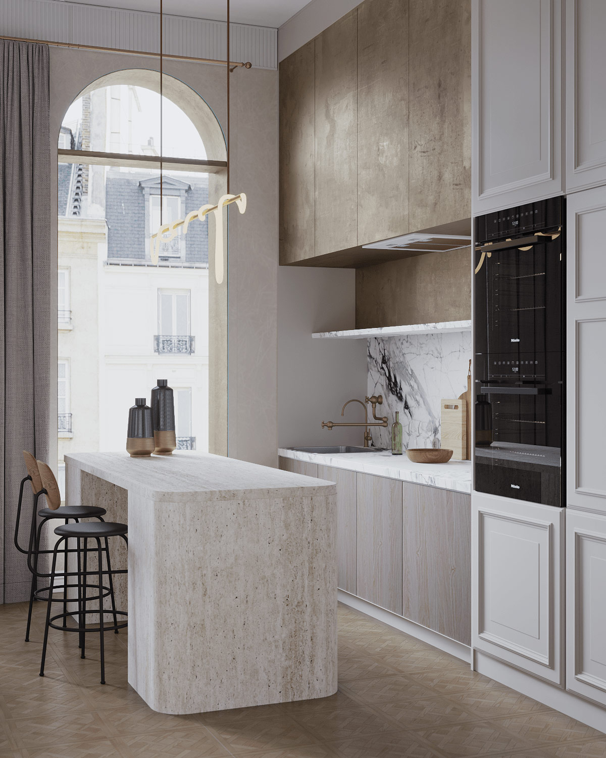 獨(dú)特的廚房設(shè)計(jì)的特點(diǎn)是金屬櫥柜正面和豪華的白色大理石臺(tái)面和后擋板。一個(gè)厚實(shí)的石灰華廚房島在現(xiàn)代吊燈下爭(zhēng)奪焦點(diǎn)。