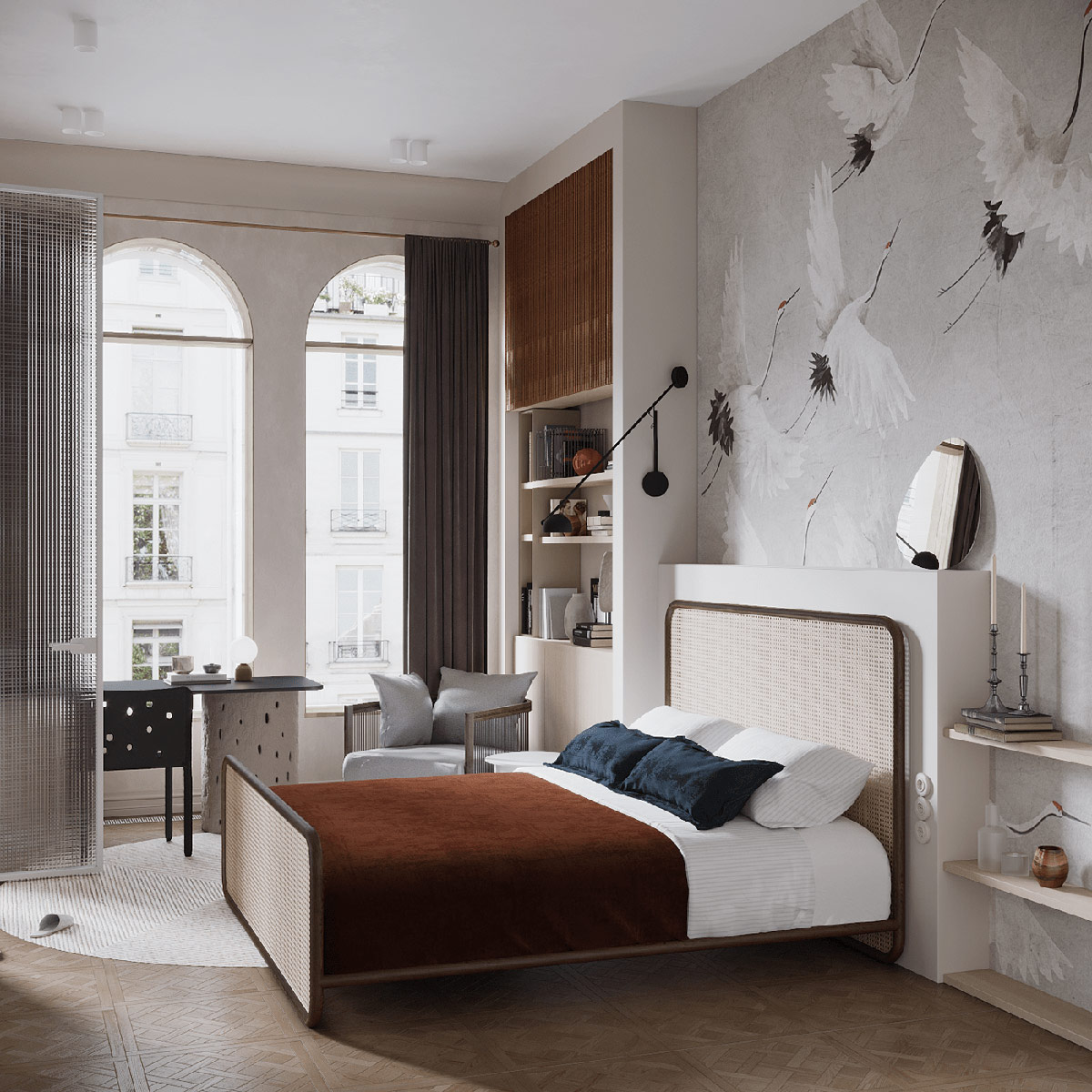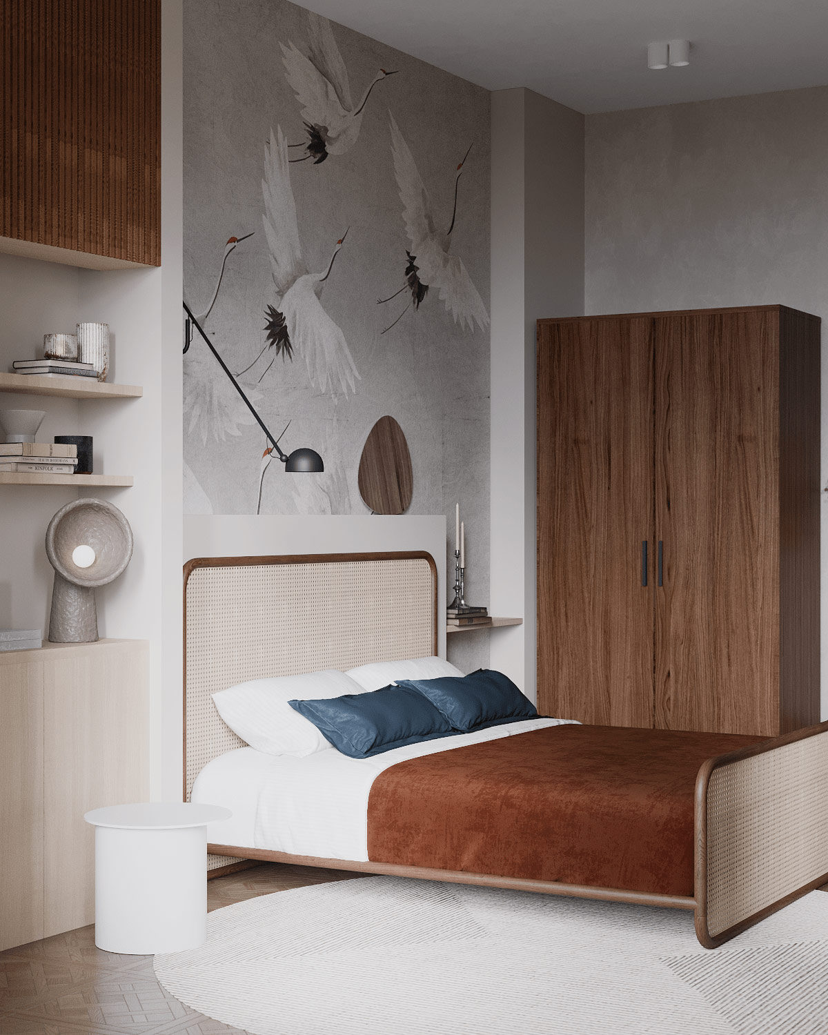在臥室內(nèi),床頭板后面的異想天開的墻壁覆蓋著一群雄偉的起重機(jī)在飛行。甲擺臂壁燈用作閱讀燈。