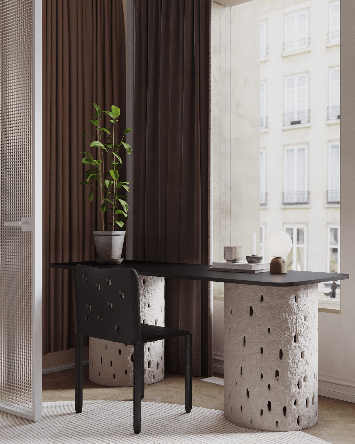 獨(dú)特的書桌和配套的椅子套裝在臥室窗戶旁提供了一個(gè)家庭工作區(qū)。