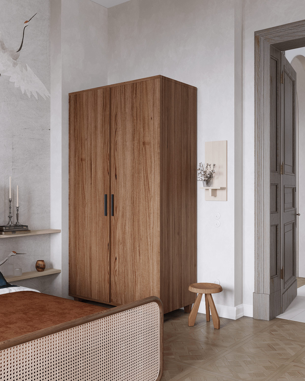 一張白色的小邊桌供應(yīng)床的一側(cè),而一組狹窄的架子在衣柜周圍留出空間。