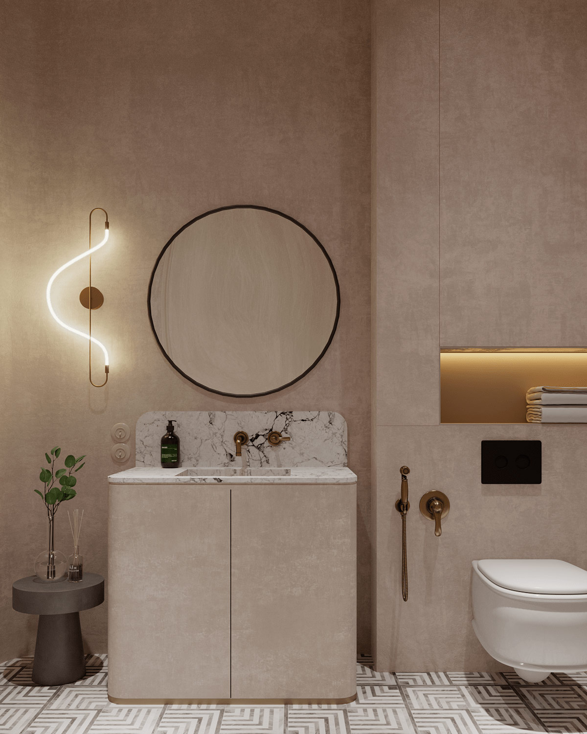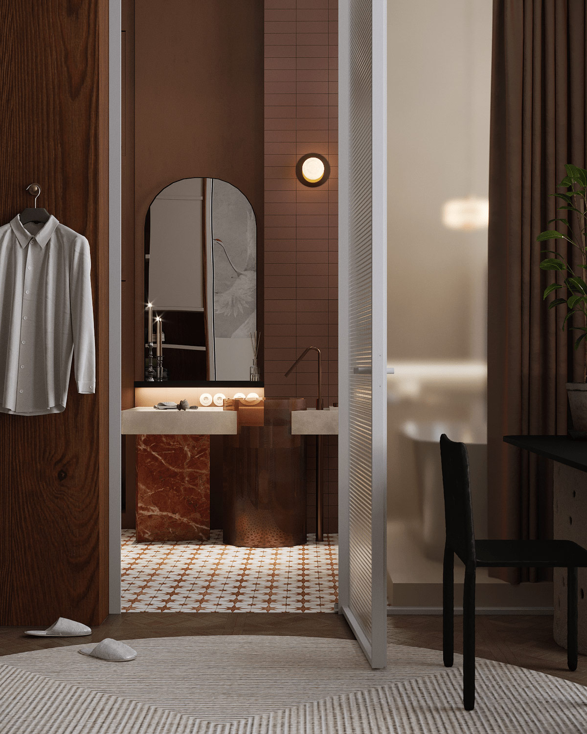 在靠近入口處的化妝間中,底座水槽單元以其粘土背景輕輕偽裝。獨(dú)特的壁燈通過豪華的白色臺(tái)面蜿蜒照明。黃銅色的光芒從蓄水池隱藏墻內(nèi)的嵌入式擱板中散發(fā)出溫暖的光芒,位于一套黃銅浴室裝置上方。
