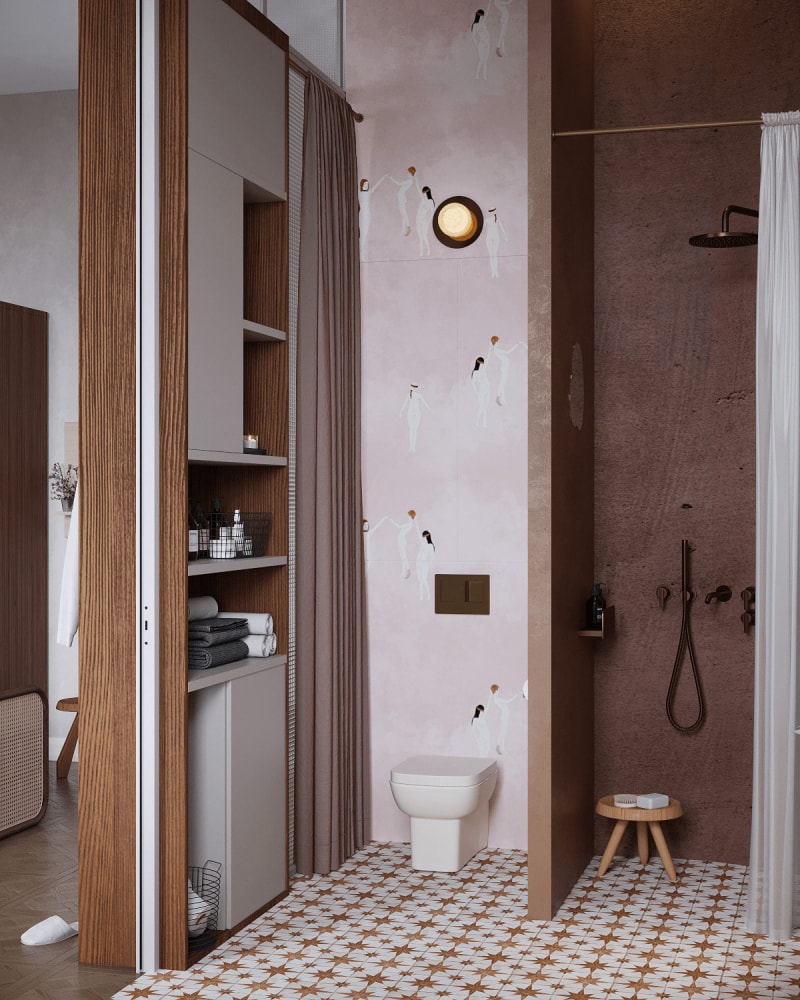 另一個(gè)說明性的墻壁覆蓋物是獨(dú)特的連接浴室的特征。紫紅色的窗簾在玻璃隔墻上畫了一層隱私面紗。