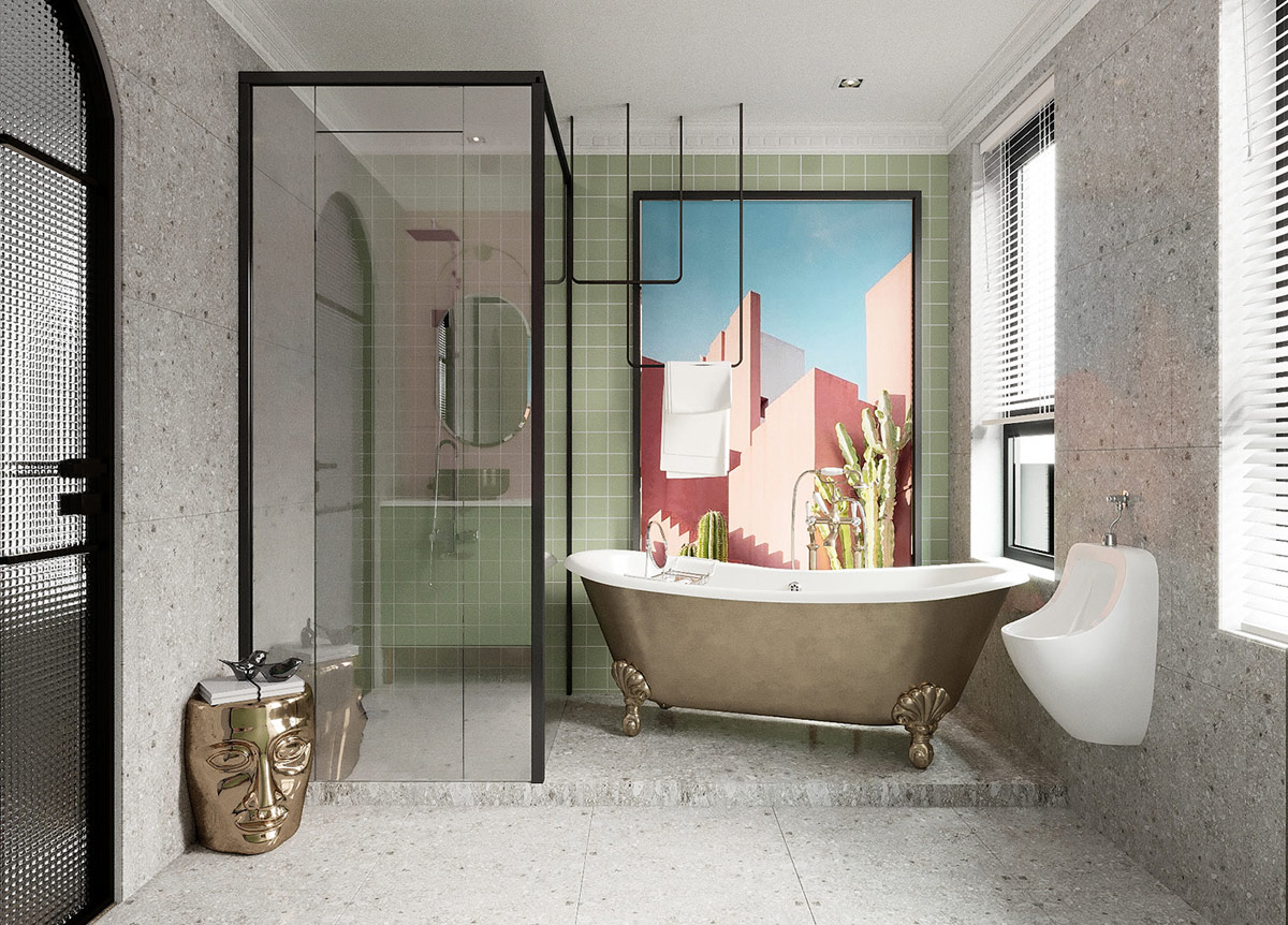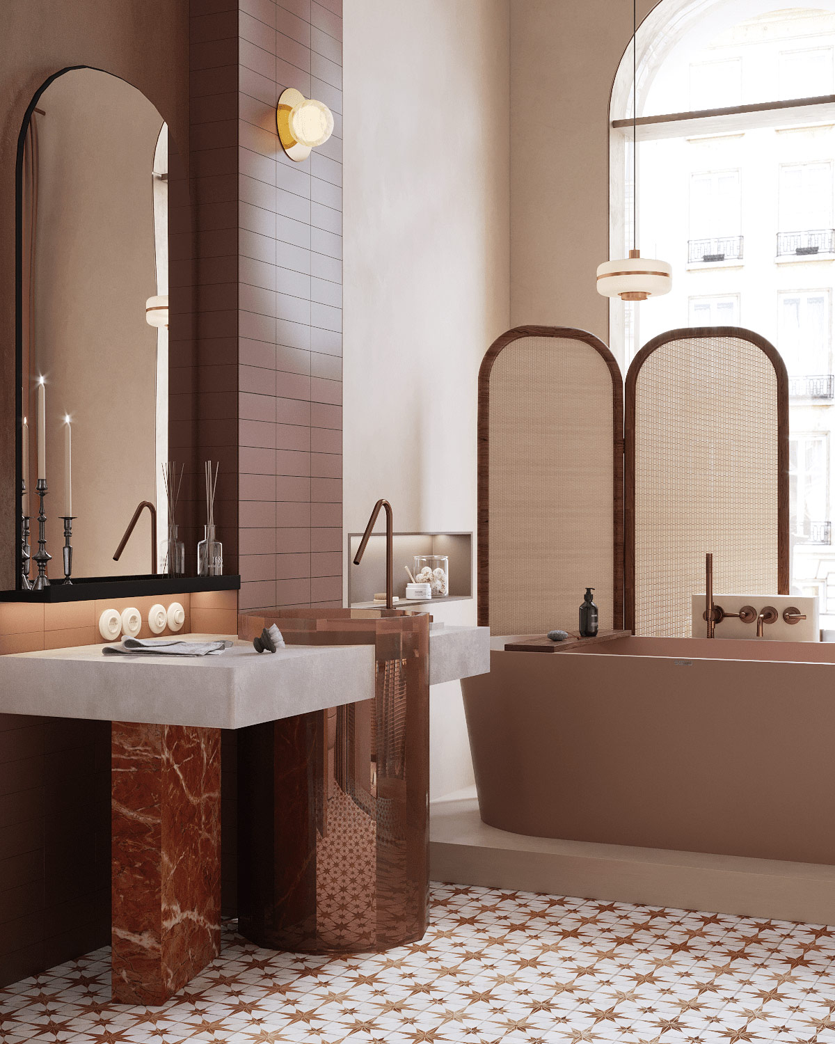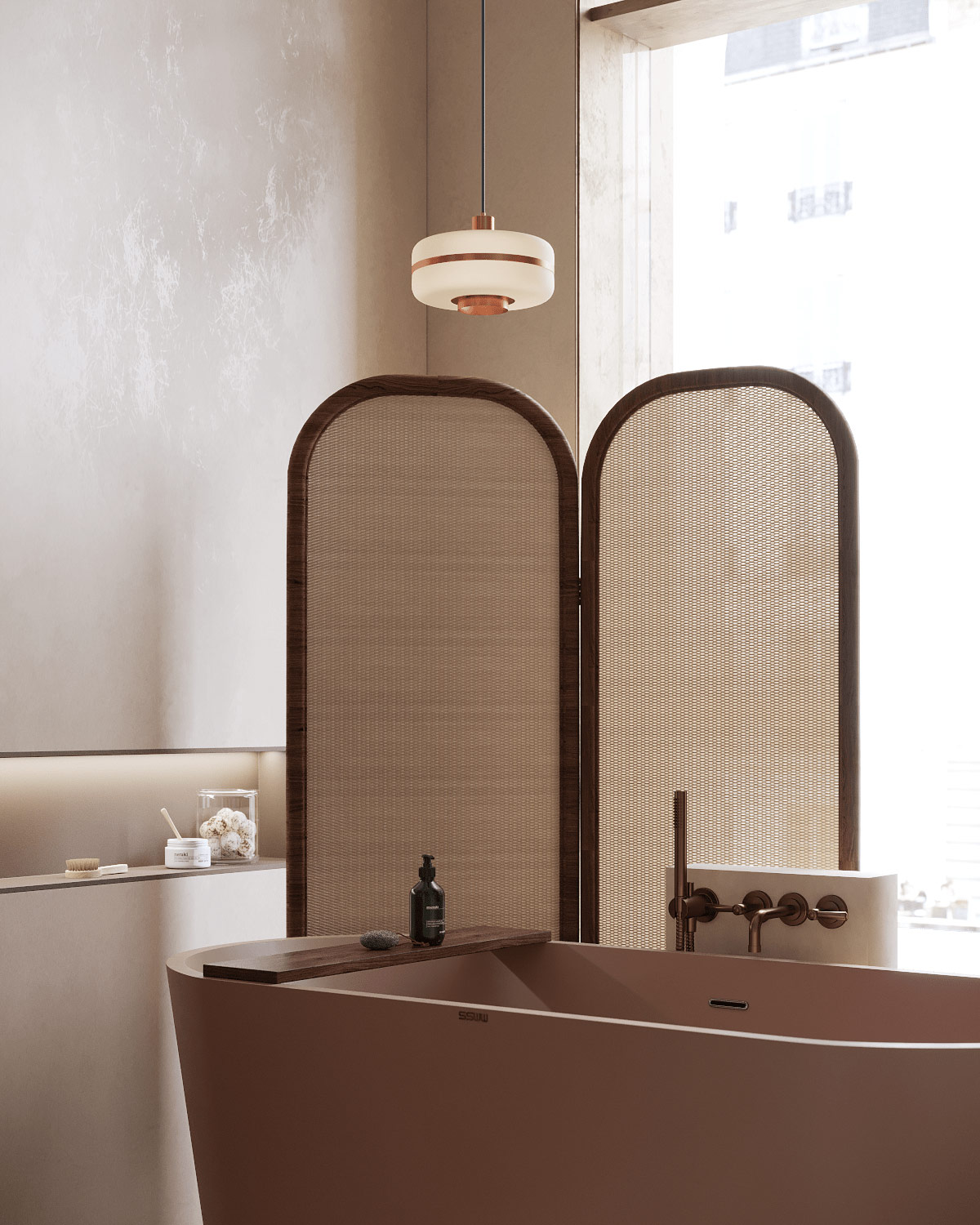 拱形屏風(fēng)優(yōu)雅地環(huán)繞著一個(gè)不尋常的赤土浴缸。
