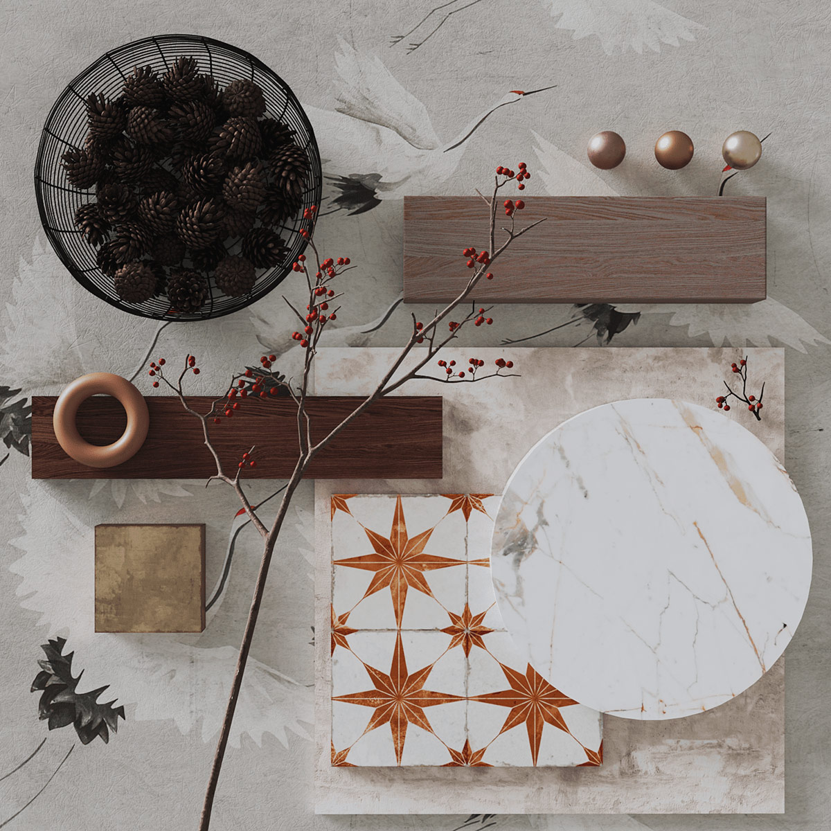 公寓的室內(nèi)設(shè)計(jì)情緒板匯集了大自然的影響。