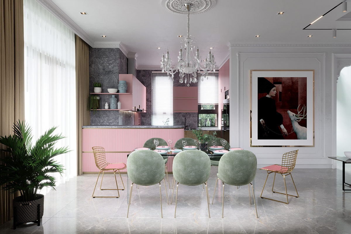 該餐廳吊燈上面的現(xiàn)代化集餐飲,包括離奇的色彩組合晶體打點(diǎn)滴。綠色 GubiBeetle 椅子和粉紅色軟墊椅子改變了淡灰色和白色的餐廳裝飾。一個(gè)引人注目的粉紅色廚房延伸到后面。