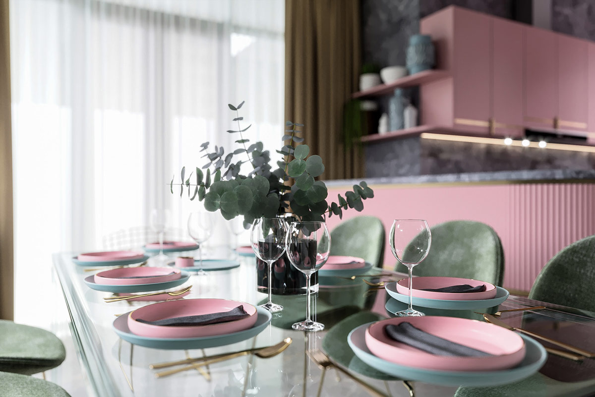 粉色和藍(lán)色餐具裝飾著玻璃桌,還有金色餐具。一個(gè)簡(jiǎn)單的葉子花瓶帶來了綠色元素。