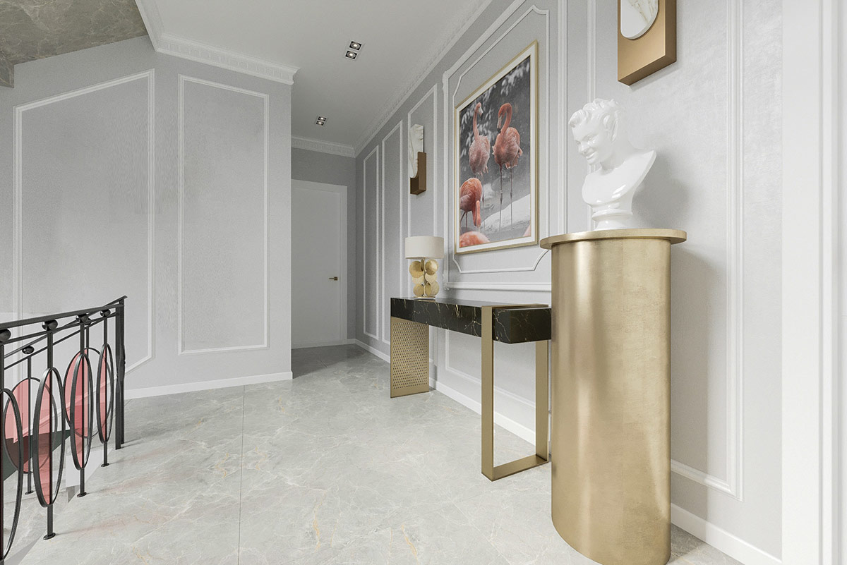 黑色大理石控制臺(tái)桌為著陸布置增加了視覺重量。黃銅壁燈帶來白色大理石對(duì)比。