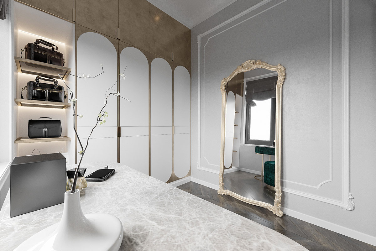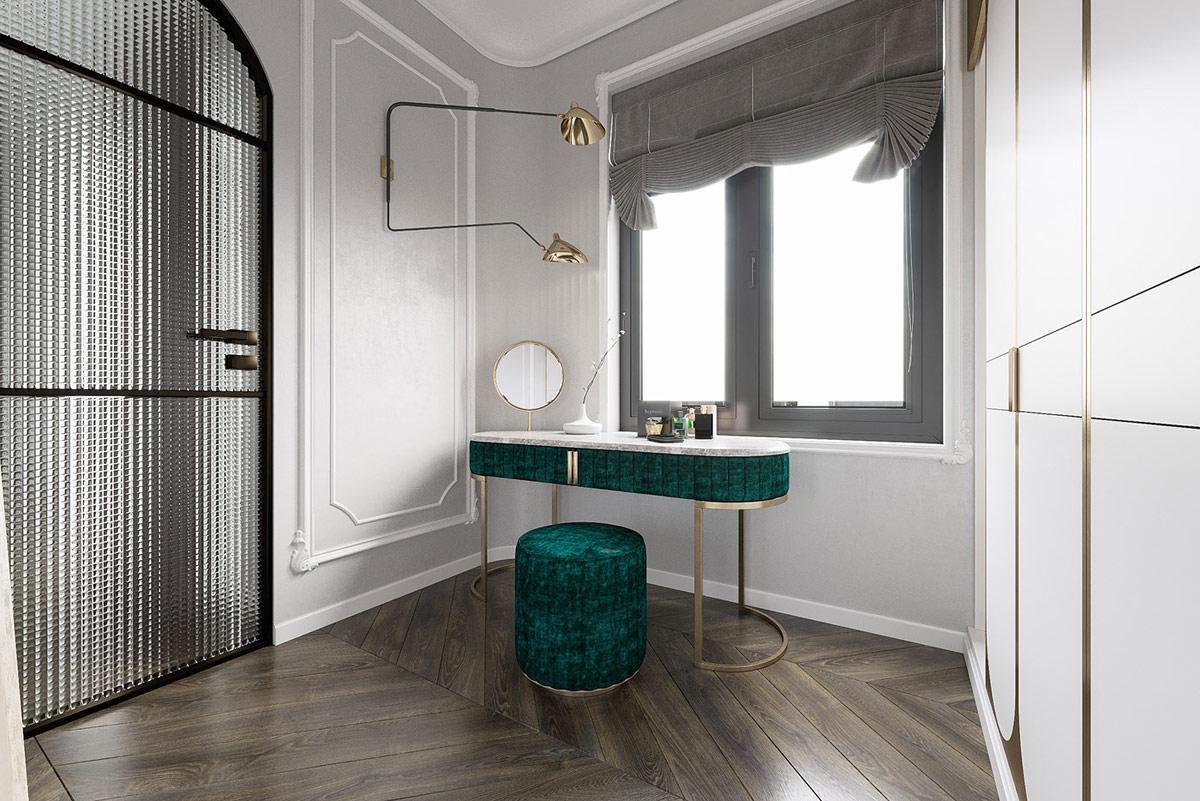 祖母綠內(nèi)飾包裹著迷人的梳妝臺(tái)和配套的梳妝凳。時(shí)尚的雙頭擺臂壁燈在集成化妝鏡上提供實(shí)用、充足的工作照明。黃銅色調(diào)貫穿家具和裝飾配件,散發(fā)出奢華的光澤。一扇拱形的帶肋玻璃門將更衣室與主臥室連接起來。