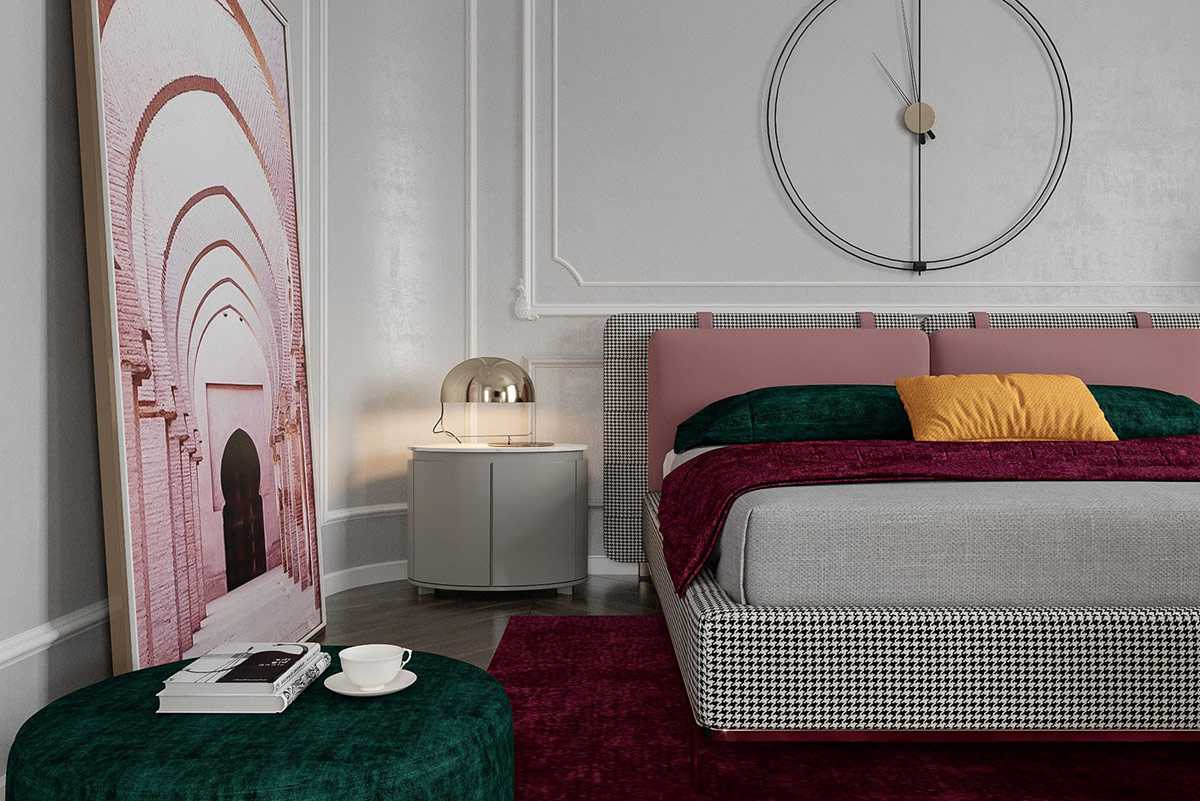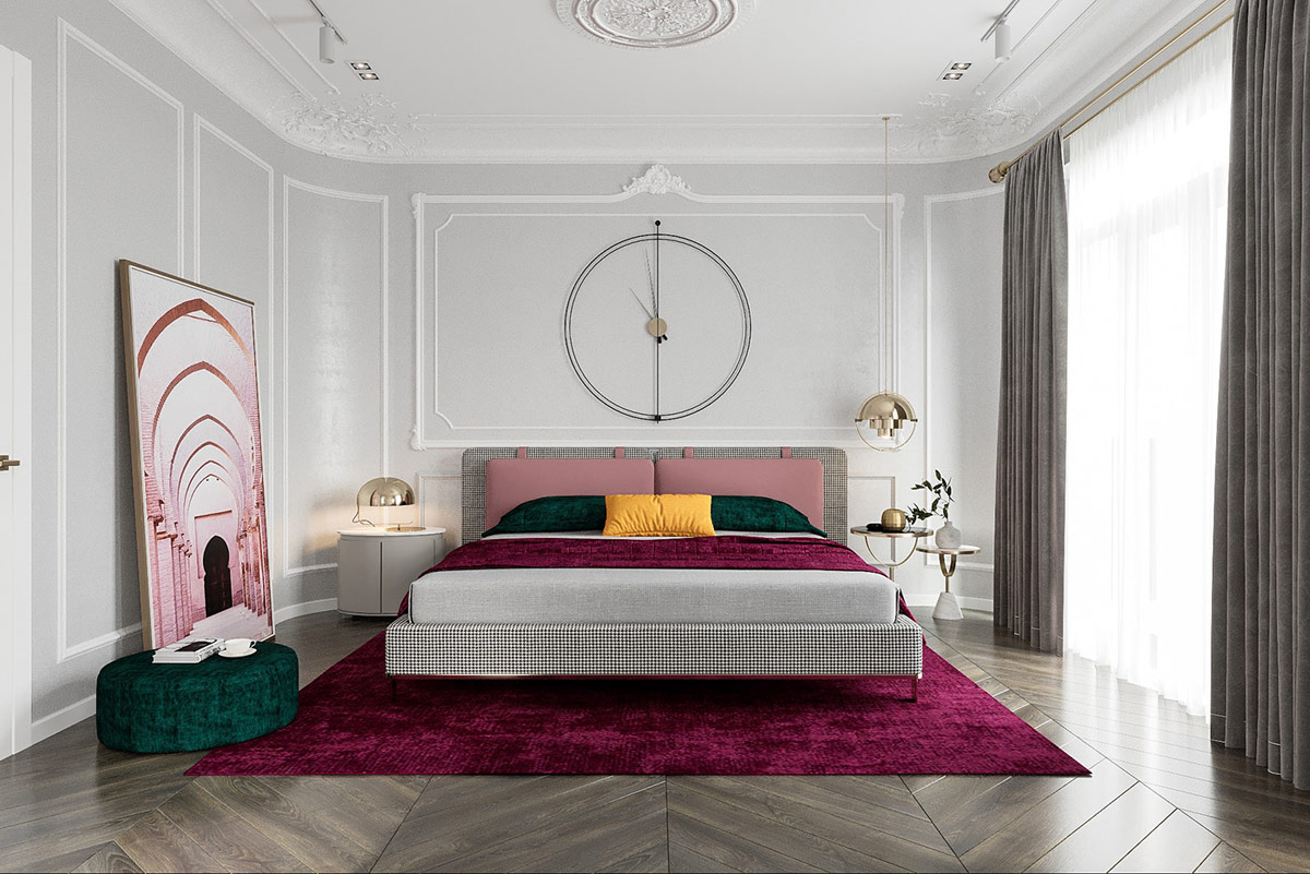 粉紅色的藝術(shù)品支撐在房間的一側(cè),而一個(gè)大掛鐘填滿了粉紅色軟墊床頭板上方的墻壁空間。