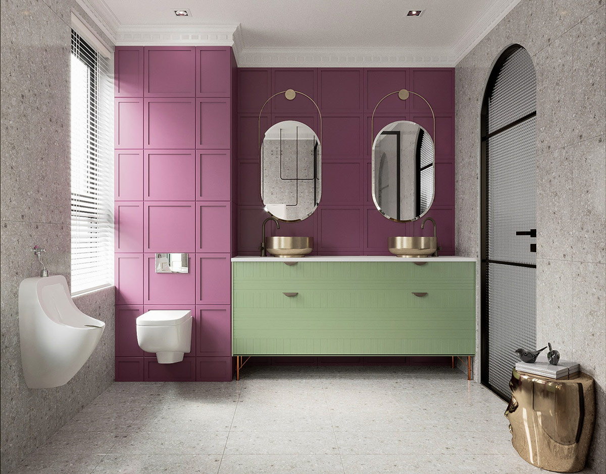 第二扇拱形羅紋玻璃門通向套間浴室。在這里,豌豆綠色雙水槽浴室梳妝臺(tái) 與葡萄鑲板后擋板和馬桶水箱隱藏墻形成了令人震驚的對(duì)比。