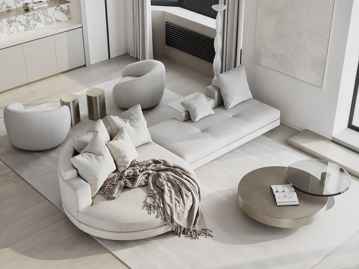 獨(dú)特的組合式沙發(fā)在寬敞豪華客廳的中央建立了一個(gè)圓形圖案。Scatter 靠墊層層疊疊,營(yíng)造出舒適宜人的休閑場(chǎng)所。