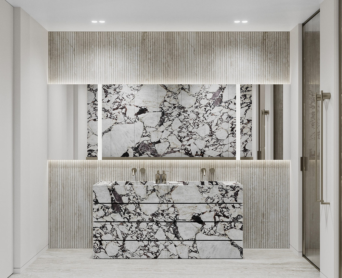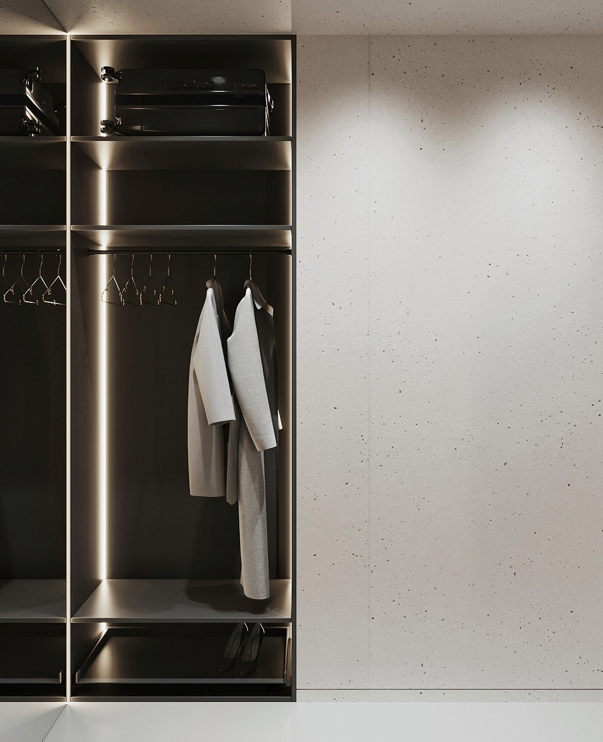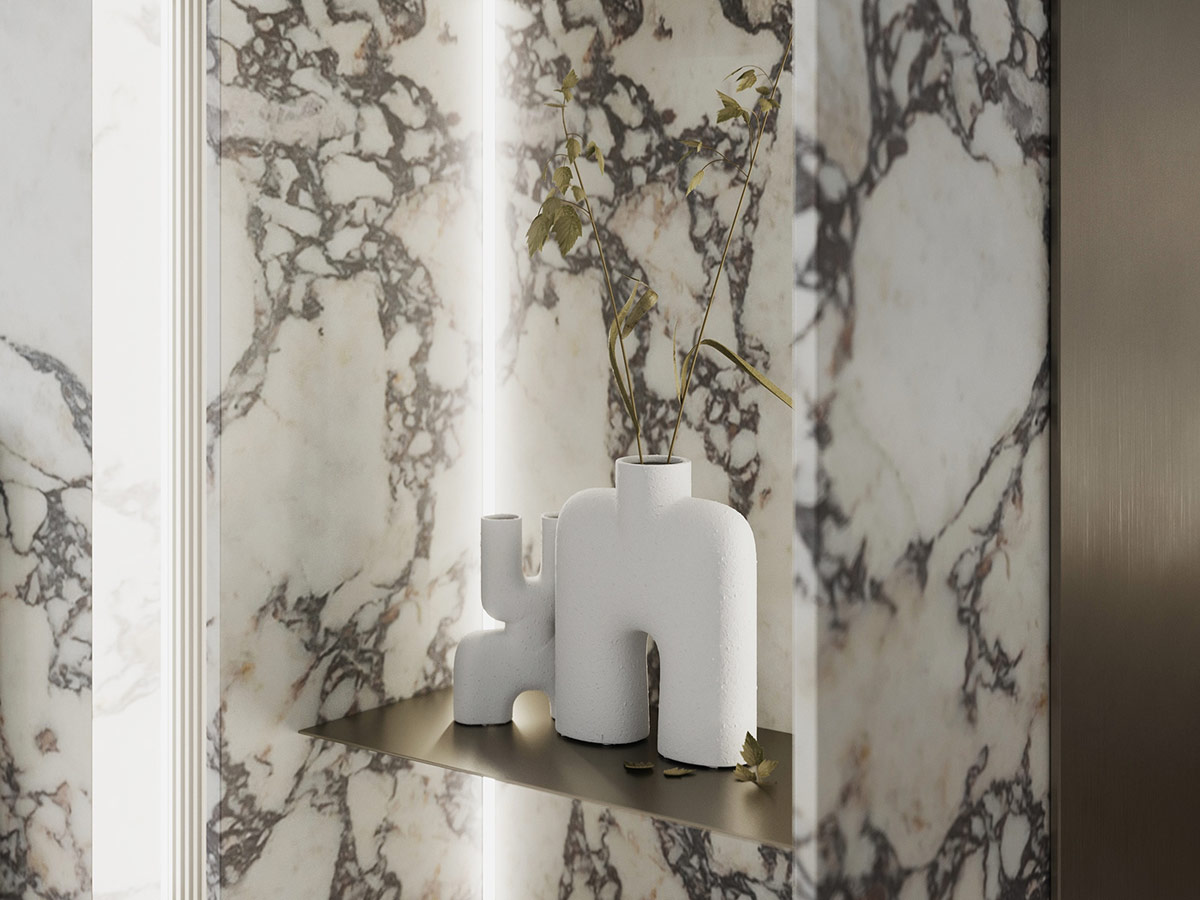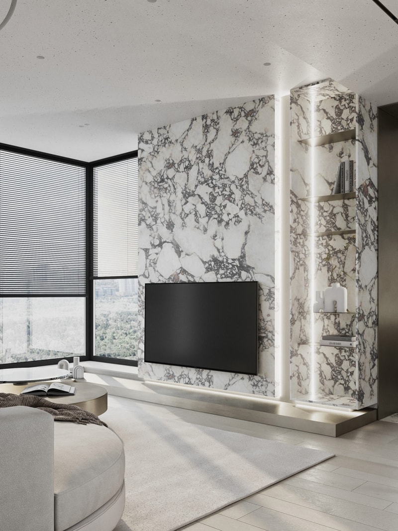 白色大理石為電視墻裝飾帶來(lái)了戲劇性的深灰色紋理級(jí)聯(lián)。拋光石材中的垂直切口漏出明亮的白色LED 燈。