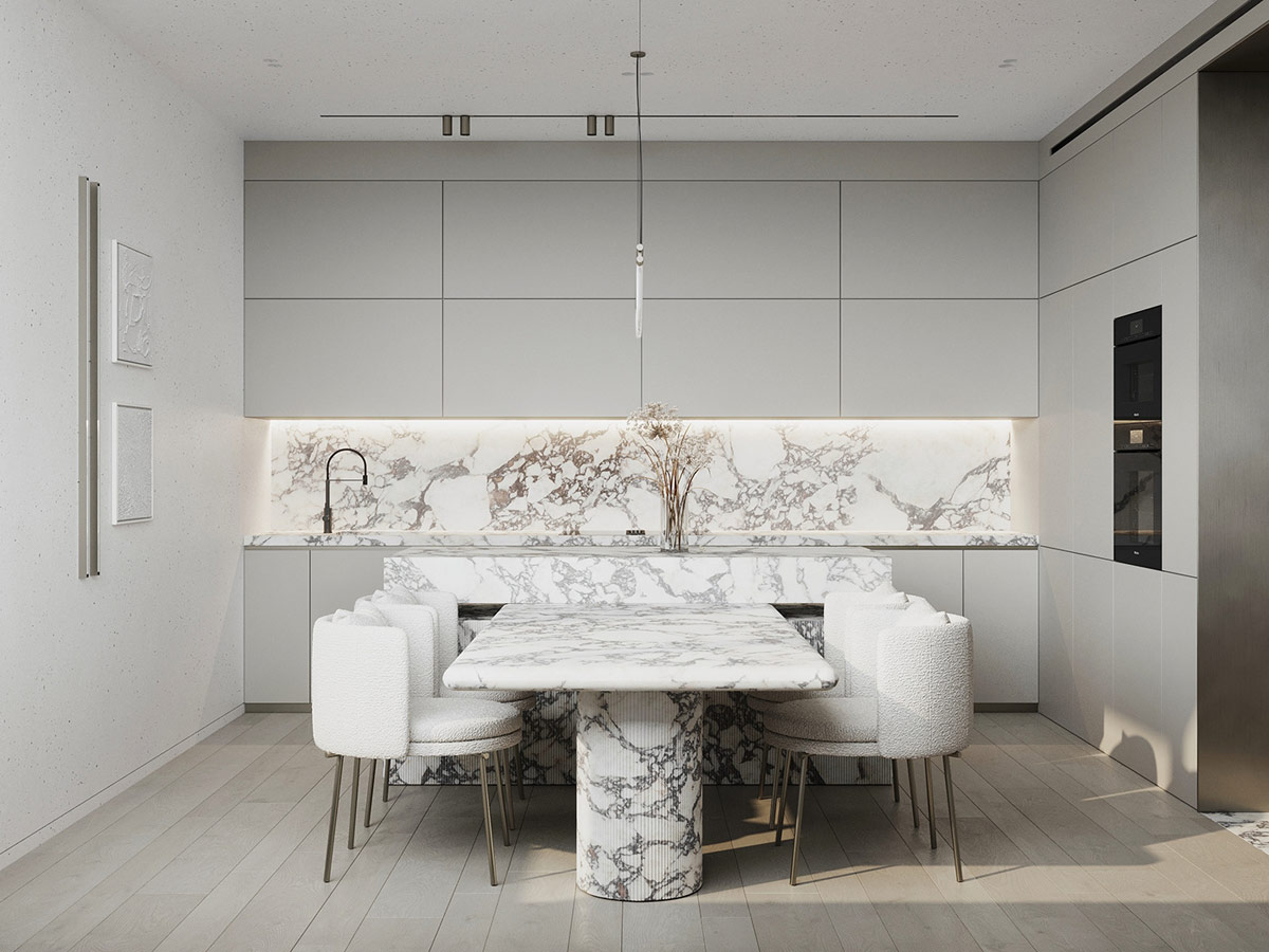 豪華的大理石裝飾提升了這間令人羨慕的莫斯科公寓完美無(wú)暇的白色內(nèi)飾,由QuadroRoom精心設(shè)計(jì)。堅(jiān)硬、耀眼的大理石表面在聚焦的 LED 燈帶下使層疊的灰色紋理光滑中斷。有光澤的金屬在大氣光下幾乎呈液態(tài)。高端現(xiàn)代家具在別致的布局中引入圓形口音,平滑和舒緩優(yōu)雅的美感。多方面的休息室布局優(yōu)雅地分為一個(gè)電視觀看區(qū)和一個(gè)閱讀角,其中顯著紋理的大理石為每個(gè)興趣點(diǎn)提供了同等的價(jià)值。我們還將看到拋光的石頭塑造了一個(gè)壯觀的用餐島、特殊的門檻和精美的擱架單元。
