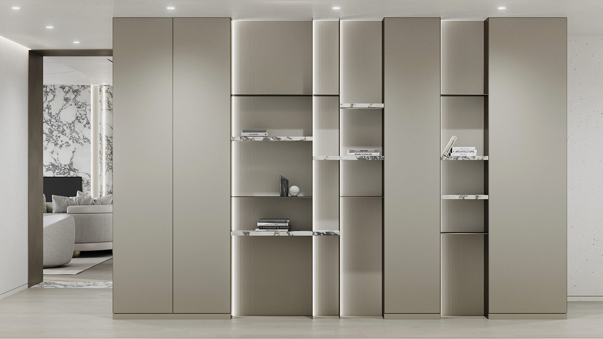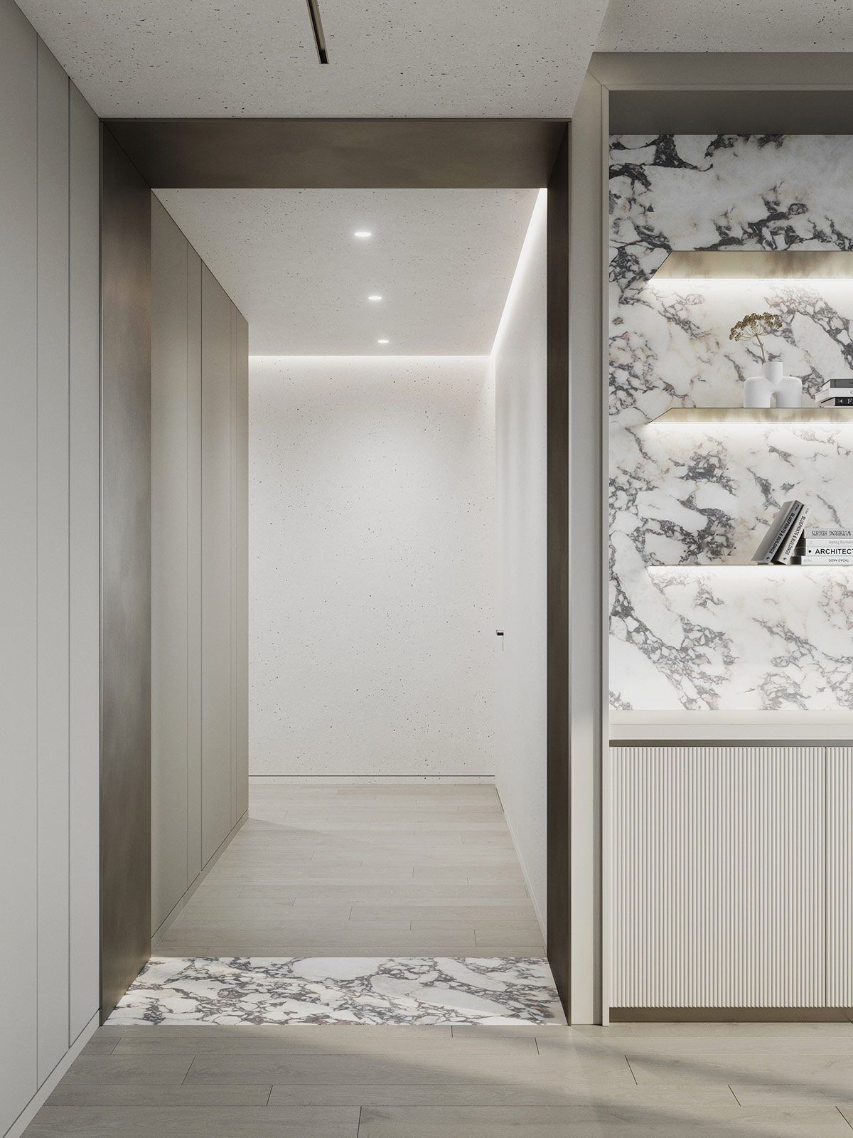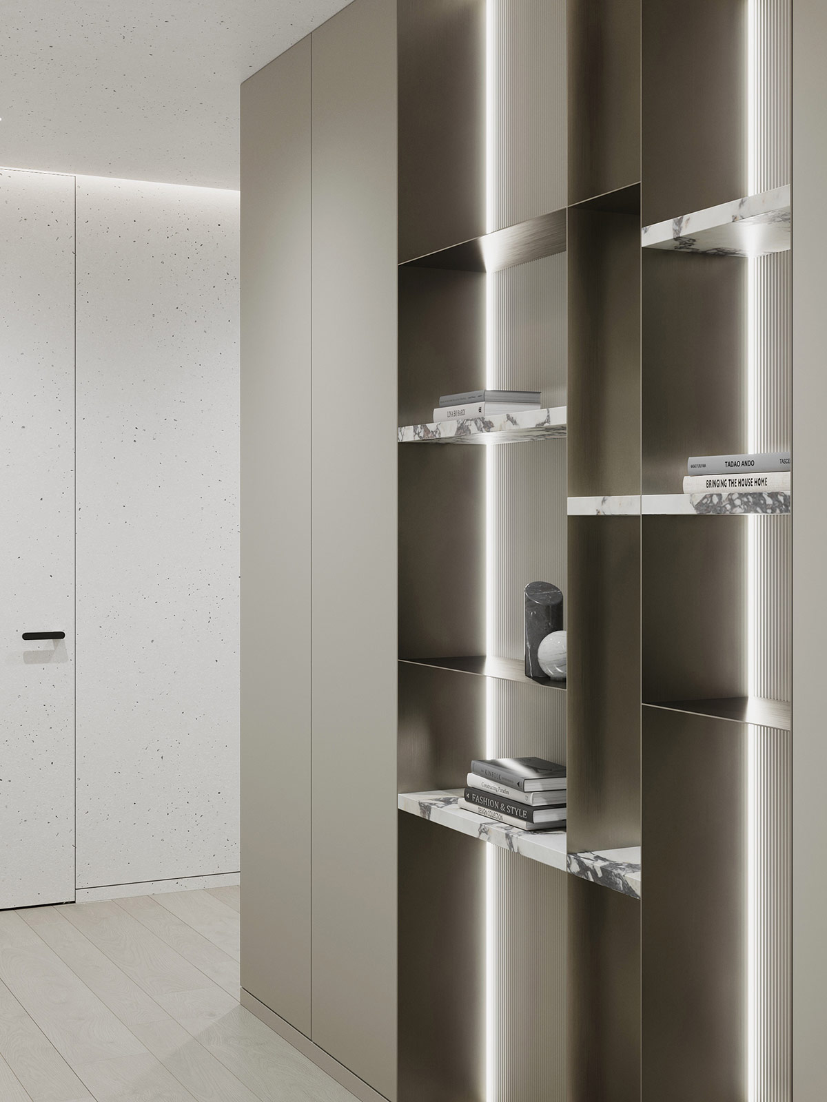 在通往臥室的走廊上,大理石架子豐富了別致的香檳書(shū)柜和儲(chǔ)物單元。