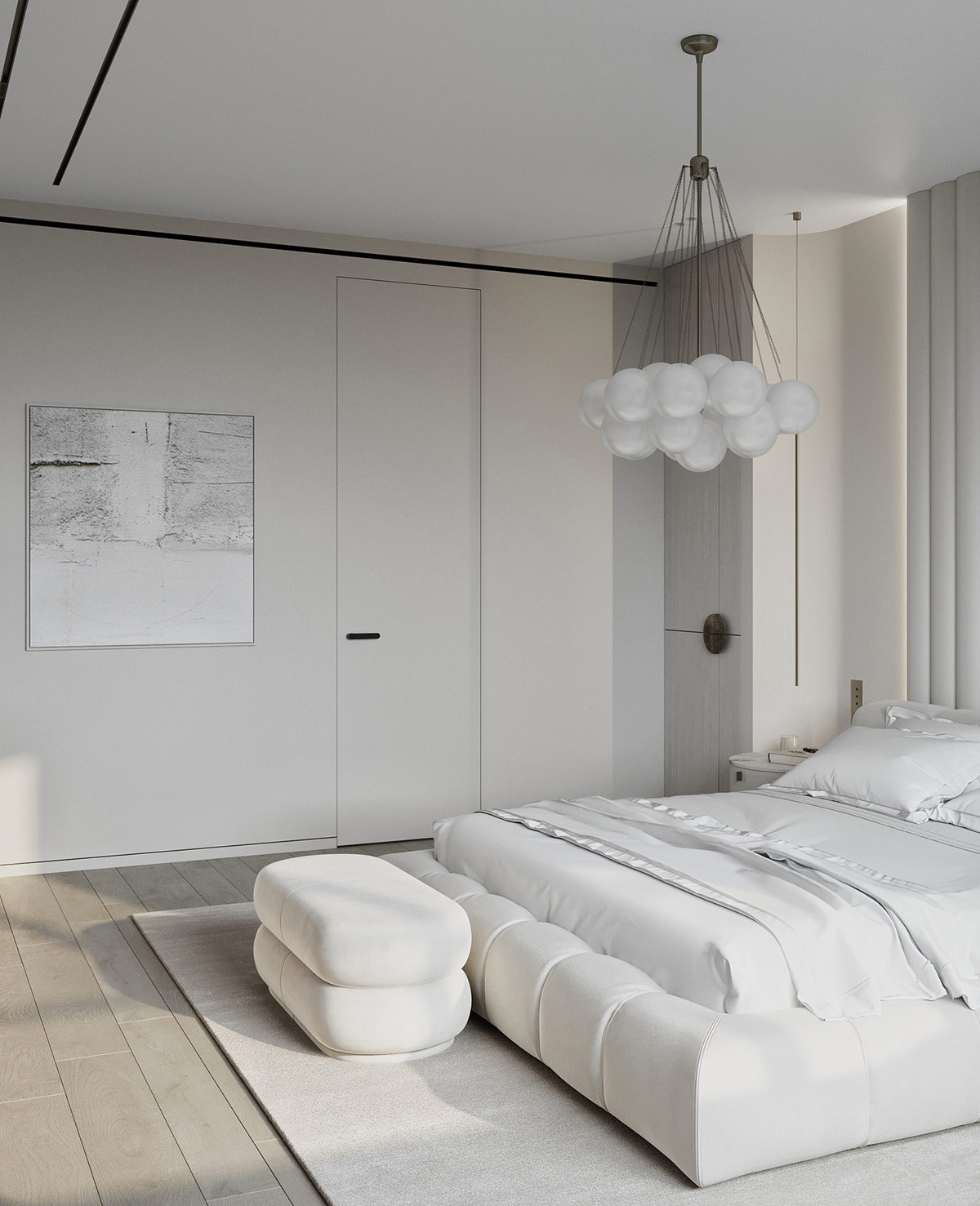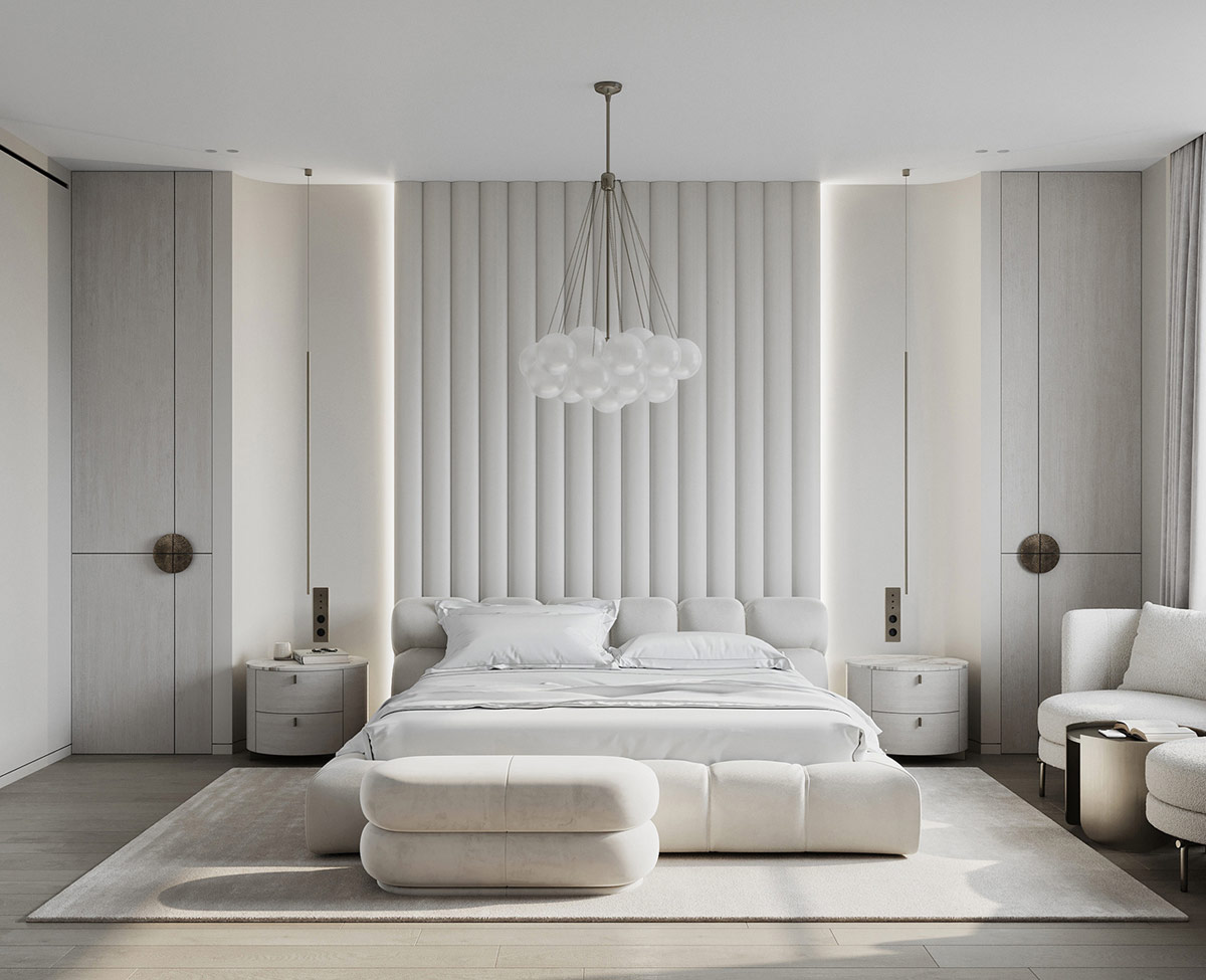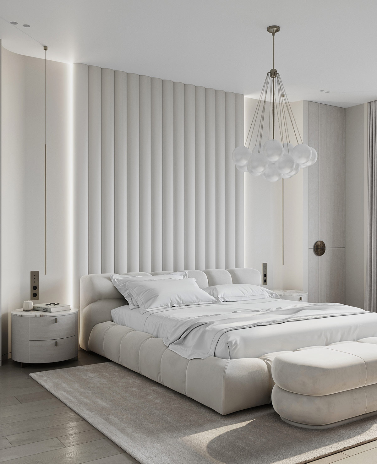 在原始的主臥室設(shè)計(jì)中,白色軟墊床從高聳的槽形簇絨床頭板中獲得了壯麗的景色。細(xì)長(zhǎng)的臥室吊燈從每張床邊細(xì)細(xì)地穿過(guò),而現(xiàn)代的枝形吊燈在床頭上方形成了一個(gè)引人注目的球體簇。
