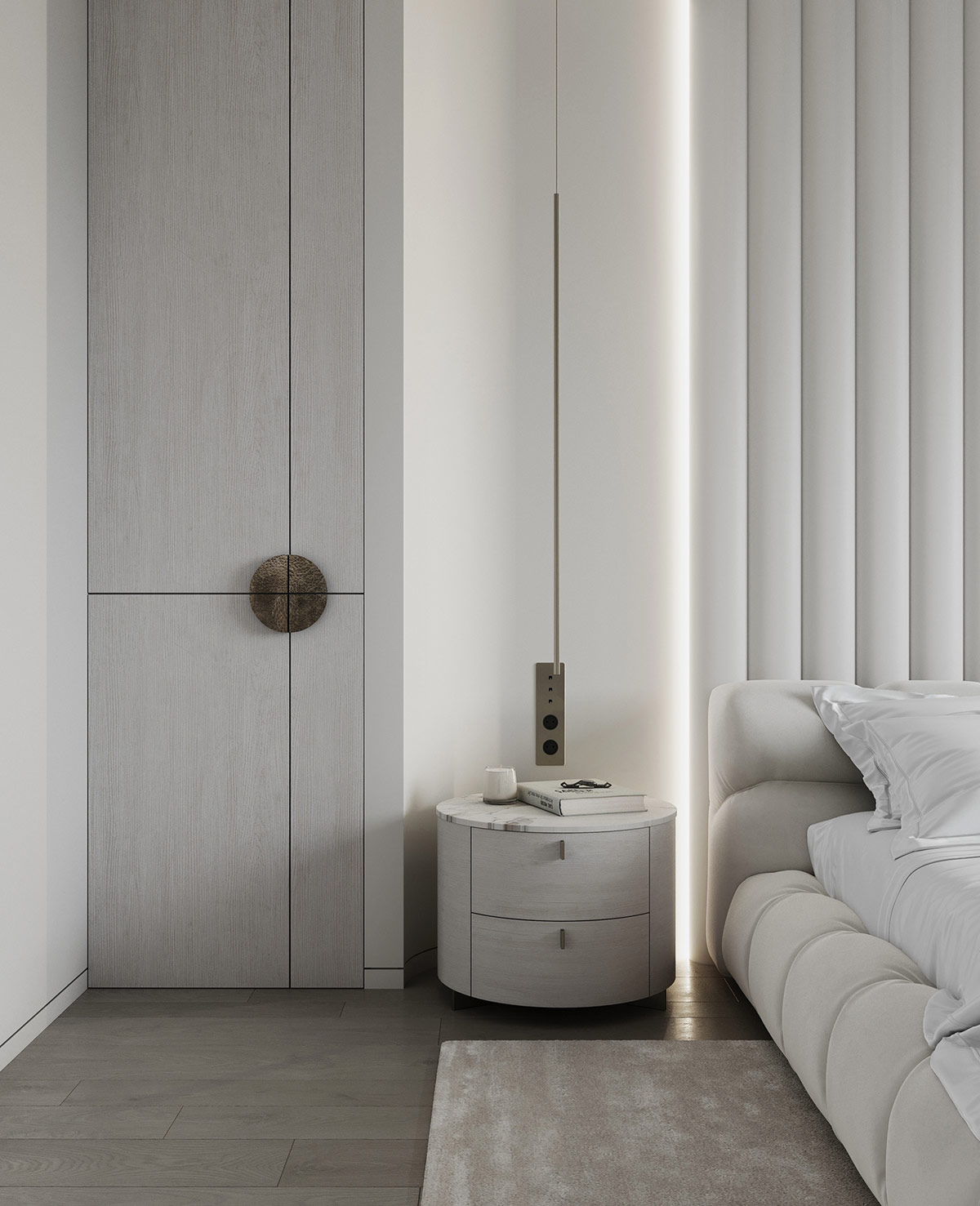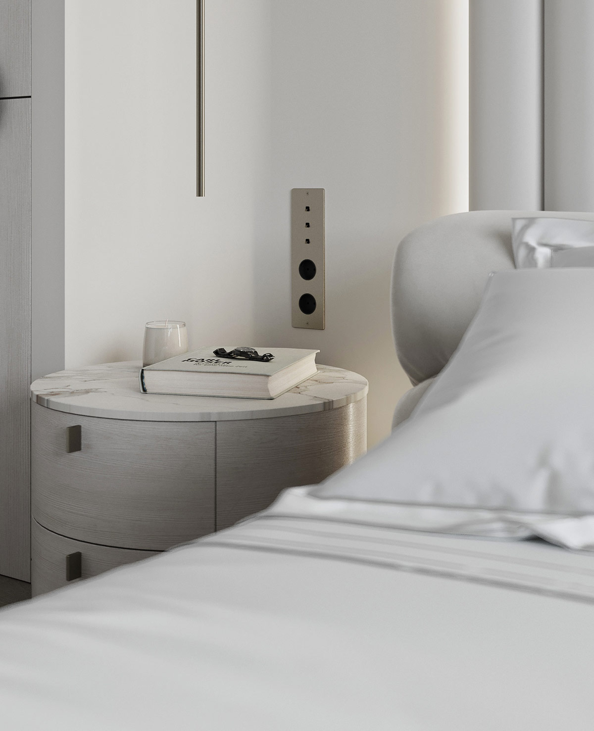 每張圓形床頭柜都鋪有豪華的白色大理石。