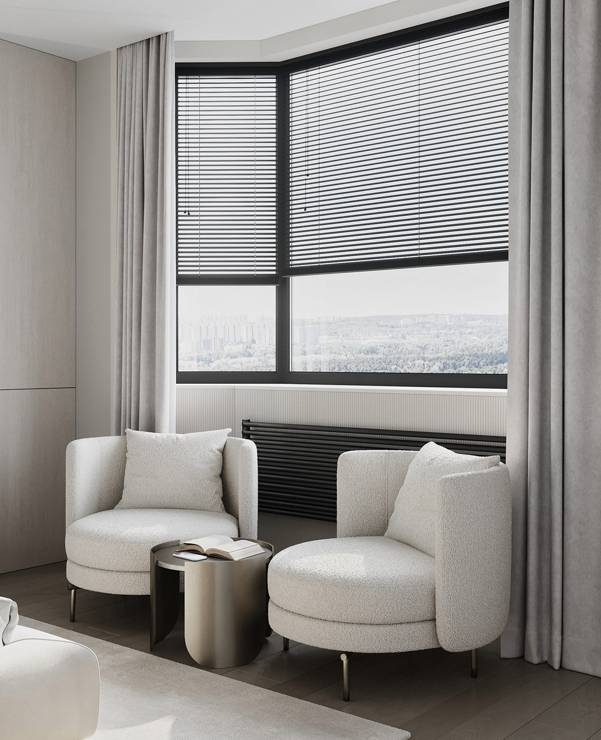 俱樂(lè)部椅子將圓形的形狀帶入現(xiàn)代沙發(fā)后面的第二個(gè)休息區(qū)。小邊桌在兩把椅子之間站著閃亮的金屬口音。