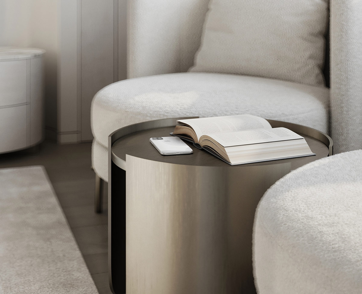 椅子和邊桌構(gòu)成了一個(gè)閱讀點(diǎn),面向獨(dú)特的壁架,背靠令人驚嘆的白色大理石。